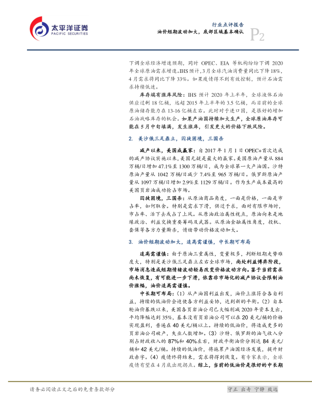 本报告分析了国际油价暴跌的原因,包括OPEC+减产谈判破裂、沙特俄罗斯价格战以及全球疫情蔓延等。报告指出,虽然油价短期波动加大,但底部区域基本确认。中长期来看,油价有望回升,是布局的好时机。报告建议关注原油产业链相关商品期货以及部分股票,并提示了相应的投资风险。 报告还详细阐述了供需关系、美沙俄三方博弈对油价的影响,以及对未来油价走势的判断。 最后,报告对行业和公司评级标准进行了明确的说明。