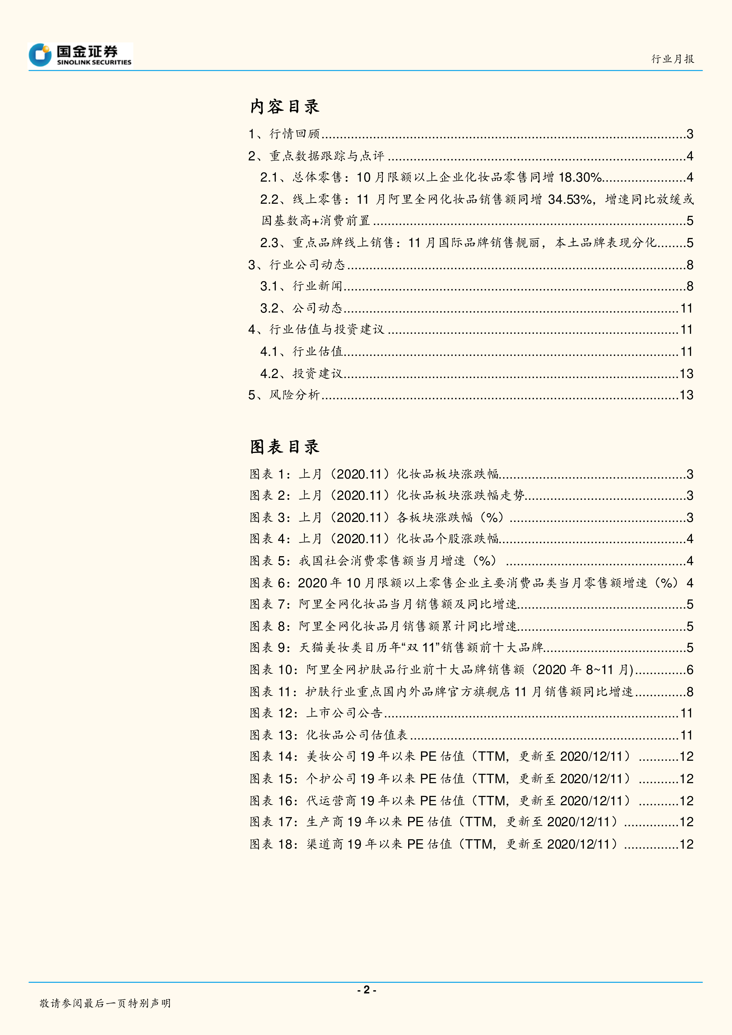 本报告的核心观点是:2020年11月,化妆品行业整体表现下滑,跑输大盘,但细分领域表现差异显著。国际品牌凭借双十一大促表现亮眼,而本土品牌则呈现出分化态势,部分品牌增长强劲,部分品牌则面临压力。功效性护肤品和彩妆是细分领域的景气赛道,值得关注。基于行业发展趋势和公司业绩表现,报告推荐关注贝泰妮、珀莱雅、华熙生物、御家汇等品牌商。