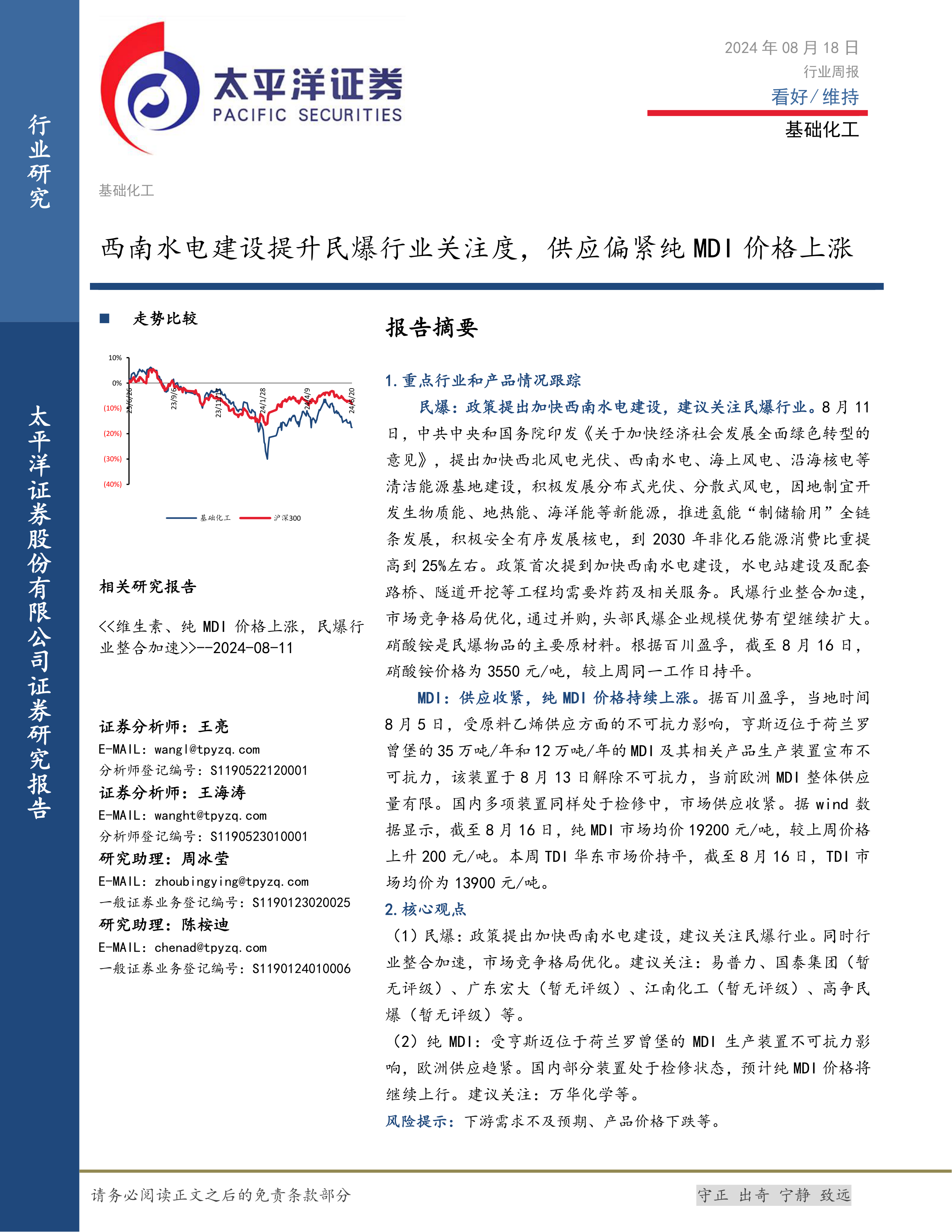 基础化工行业周报:西南水电建设提升民爆行业关注度,供应偏紧纯MDI价格上涨