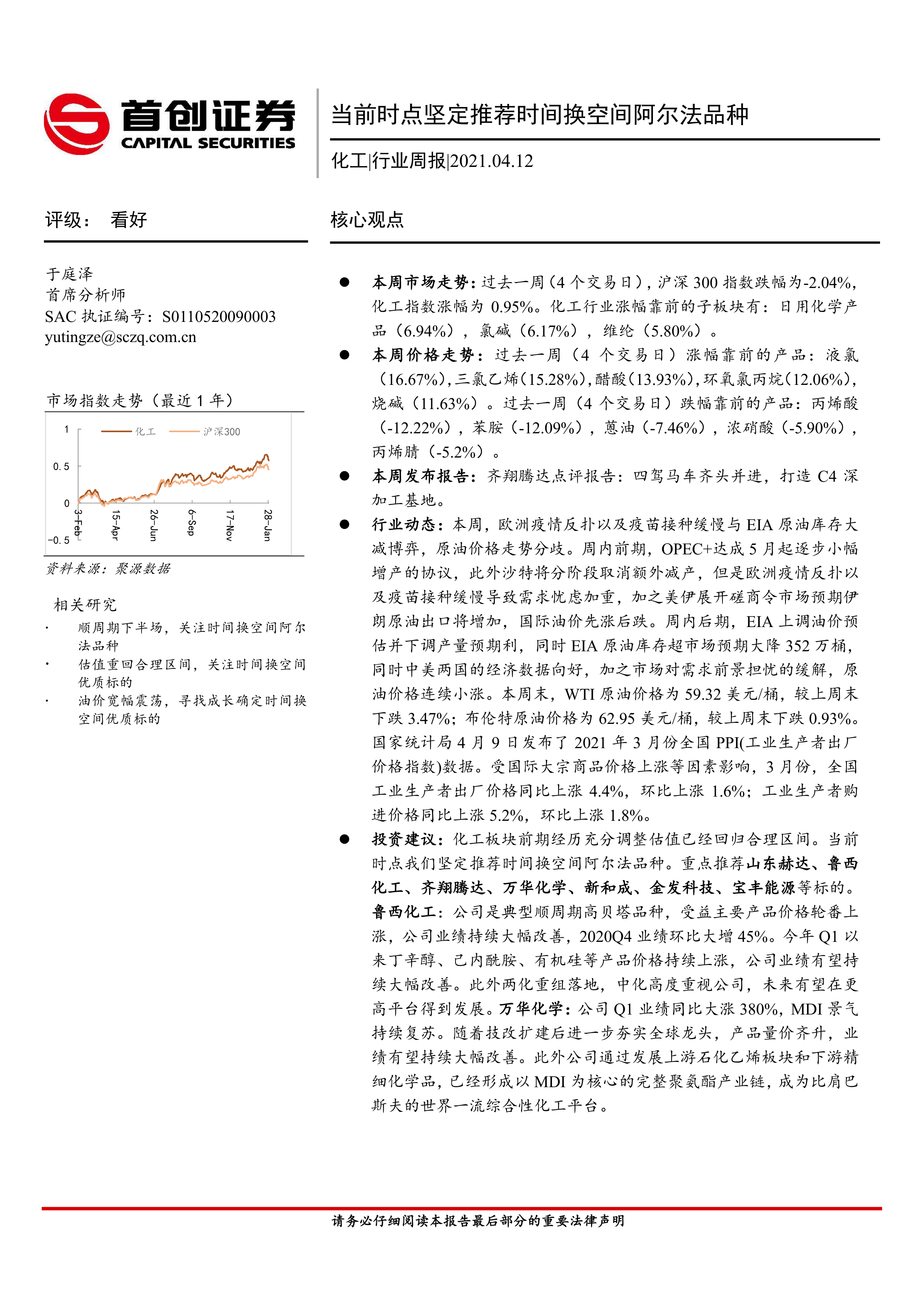 投资建议:化工板块前期经历充分调整估值已经回归合理区间。当前时点我们坚定推荐时间换空间阿尔法品种。重点推荐山东赫达、鲁西化工、齐翔腾达、万华化学、新和成、金发科技、宝丰能源等标的。鲁西化工:公司是典型顺周期高贝塔品种,受益主要产品价格轮番上涨,公司业绩持续大幅改善,2020Q4业绩环比大增45%。今年Q1以来丁辛醇、己内酰胺、有机硅等产品价格持续上涨,公司业绩有望持续大幅改善。此外两化重组落地,中化高度重视公司,未来有望在更高平台得到发展。万华化学:公司Q1业绩同比大涨380%,MDI景气持续复苏。随着技改扩建后进一步夯实全球龙头,产品量价齐升,业绩有望持续大幅改善。此外公司通过发展上游石化乙烯板块和下游精细化学品,已经形成以MDI为核心的完整聚氨酯产业链,成为比肩巴斯夫的世界一流综合性化工平台。