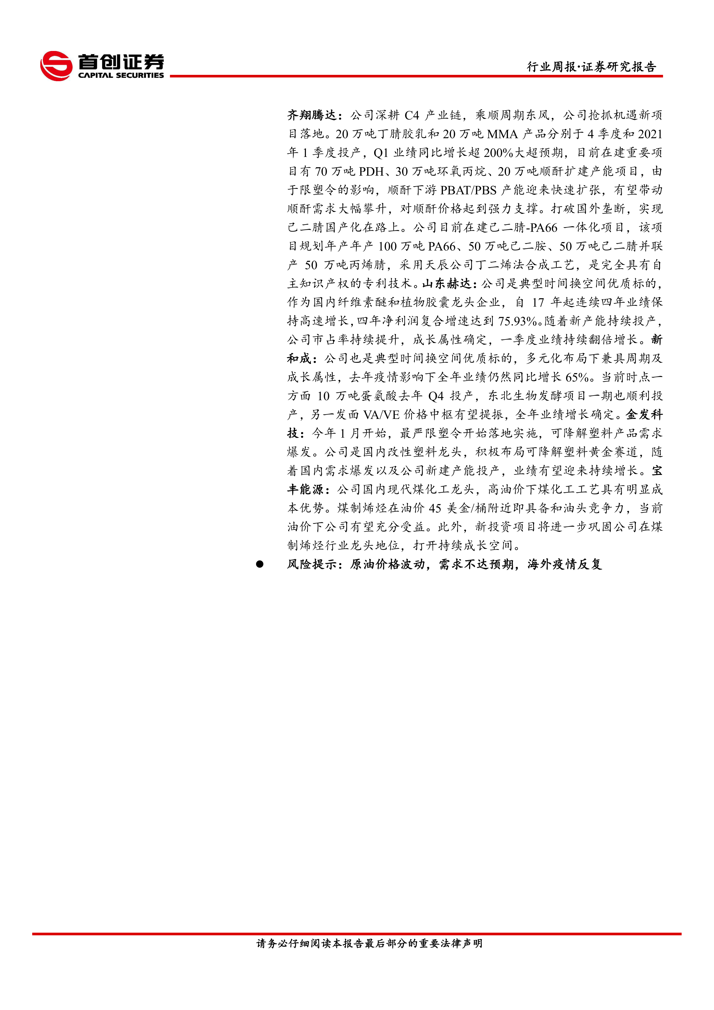 齐翔腾达:公司深耕C4产业链,乘顺周期东风,公司抢抓机遇新项目落地。20万吨丁腈胶乳和20万吨MMA产品分别于4季度和2021年1季度投产,Q1业绩同比增长超200%大超预期,目前在建重要项目有70万吨PDH、30万吨环氧丙烷、20万吨顺酐扩建产能项目,由于限塑令的影响,顺酐下游PBAT/PBS产能迎来快速扩张,有望带动顺酐需求大幅攀升,对顺酐价格起到强力支撑。打破国外垄断,实现己二腈国产化在路上。公司目前在建己二腈-PA66一体化项目,该项目规划年产年产100万吨PA66、50万吨己二胺、50万吨己二腈并联产50万吨丙烯腈,采用天辰公司丁二烯法合成工艺,是完全具有自主知识产权的专利技术。山东赫达:公司是典型时间换空间优质标的,作为国内纤维素醚和植物胶囊龙头企业,自17年起连续四年业绩保持高速增长,四年净利润复合增速达到75.93%。随着新产能持续投产,公司市占率持续提升,成长属性确定,一季度业绩持续翻倍增长。新和成:公司也是典型时间换空间优质标的,多元化布局下兼具周期及成长属性,去年疫情影响下全年业绩仍然同比增长65%。当前时点一方面10万吨蛋氨酸去年Q4投产,东北生物发酵项目一期也顺利投产,另一发面VA/VE价格中枢有望提振,全年业绩增长确定。金发科技:今年1月开始,最严限塑令开始落地实施,可降解塑料产品需求爆发。公司是国内改性塑料龙头,积极布局可降解塑料黄金赛道,随着国内需求爆发以及公司新建产能投产,业绩有望迎来持续增长。宝丰能源:公司国内现代煤化工龙头,高油价下煤化工工艺具有明显成本优势。煤制烯烃在油价45美金/桶附近即具备和油头竞争力,当前油价下公司有望充分受益。此外,新投资项目将进一步巩固公司在煤制烯烃行业龙头地位,打开持续成长空间。