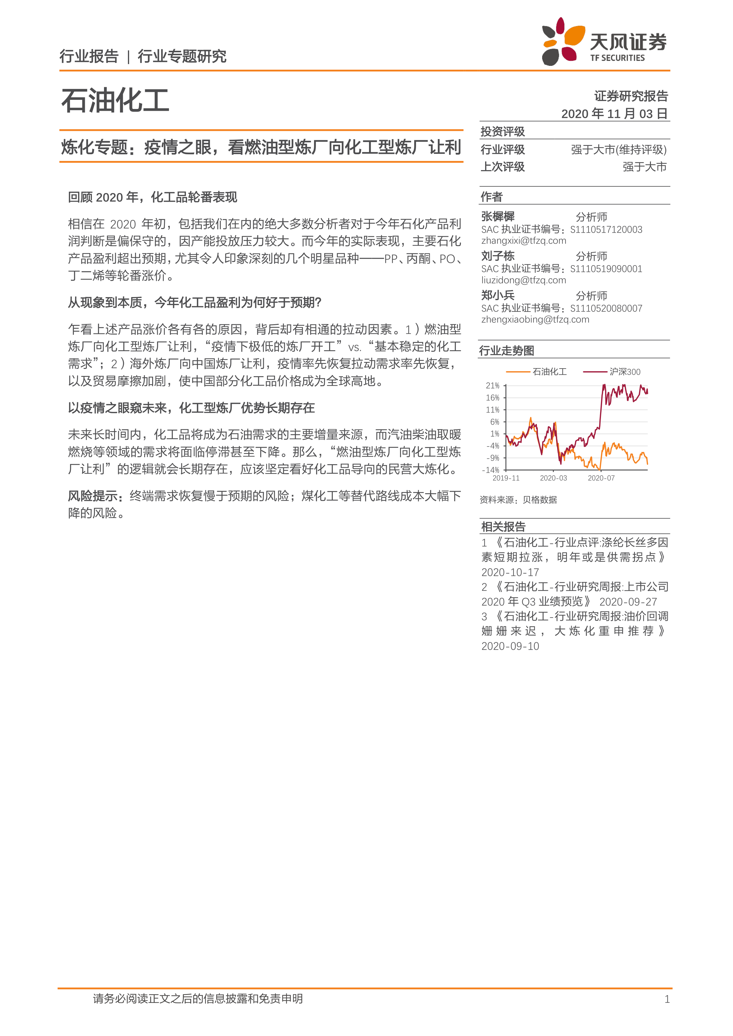 本报告的核心观点是:2020年石化产品盈利超出预期,主要原因是燃油型炼厂向化工型炼厂让利,以及海外炼厂向中国炼厂让利,导致化工品供需格局好于预期。未来,化工品将成为石油需求的主要增量来源,化工型炼厂的优势将长期存在,建议坚定看好化工品导向的民营大炼化。