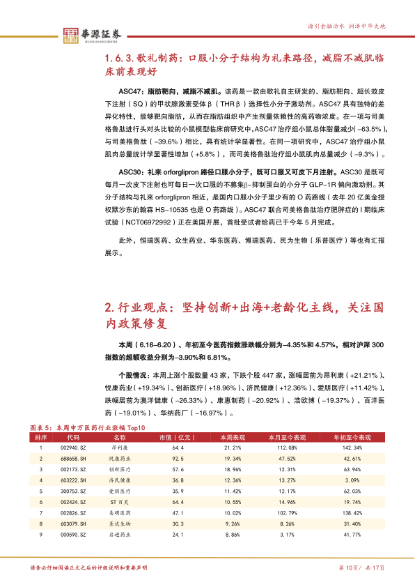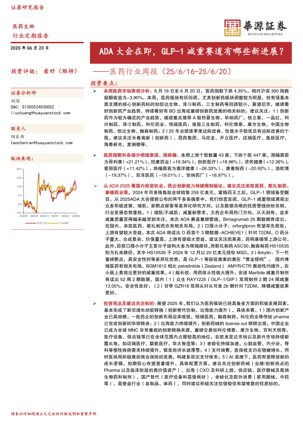 本报告基于对ADA 2025大会上GLP-1减重赛道新进展的分析,以及对医药行业整体发展趋势的研判,维持对医药行业的看好评级。报告建议投资者关注GLP-1减重赛道上的国内企业,并根据“创新+出海+老龄化”主线,选择具有长期发展潜力的细分领域和个股进行投资,同时需关注潜在的风险因素。 报告提供了具体的投资建议组合,但投资者仍需根据自身情况进行独立判断。
