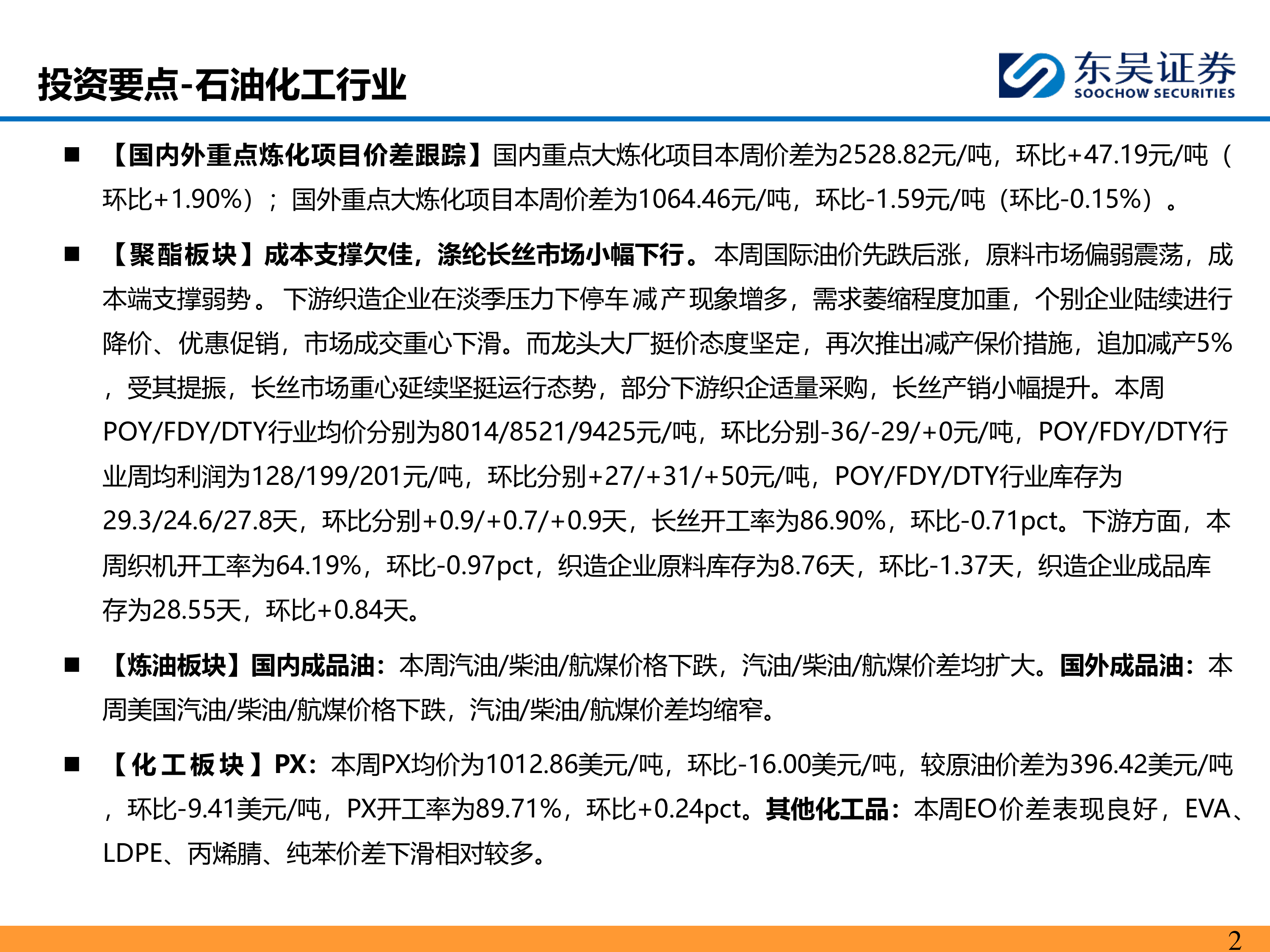 环比+1.90%);国外重点大炼化项目本周价差为1064.46元/吨,环比-1.59元/吨(环比-0.15%)。