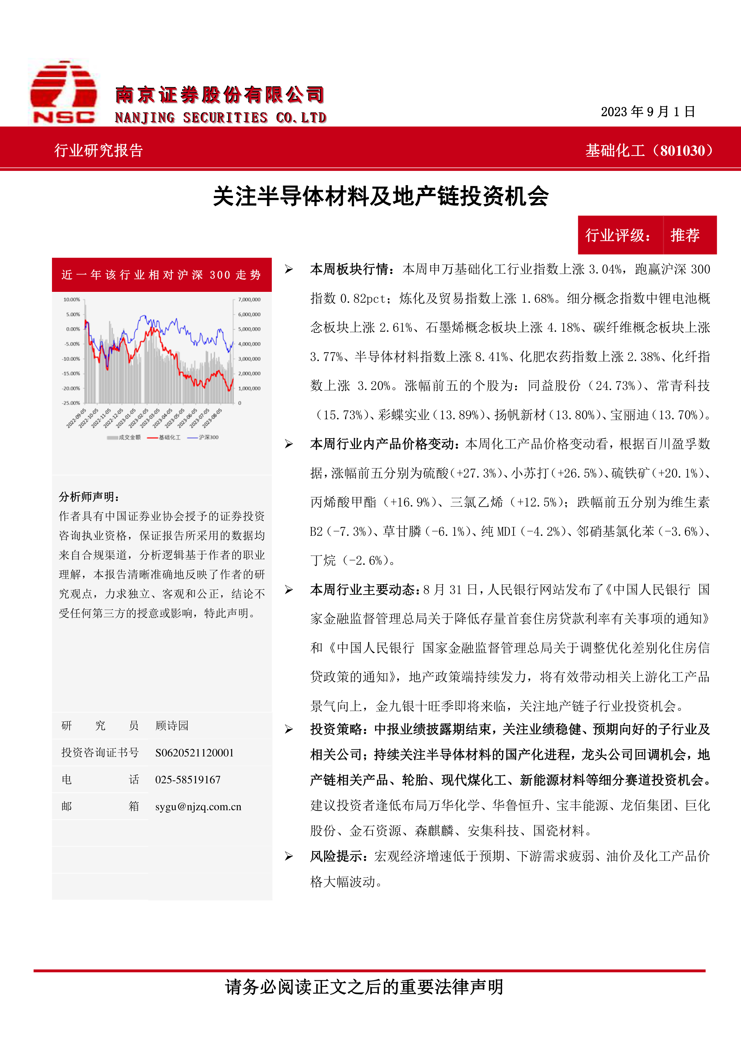 本报告的核心观点是:基础化工行业近期表现强劲,部分细分领域涨幅显著,尤其半导体材料和地产链相关板块值得关注。 报告建议投资者关注业绩稳健、预期向好的子行业及相关公司,并逢低布局部分优质个股。 同时,报告也指出了宏观经济下行、下游需求疲软以及价格波动等潜在风险。