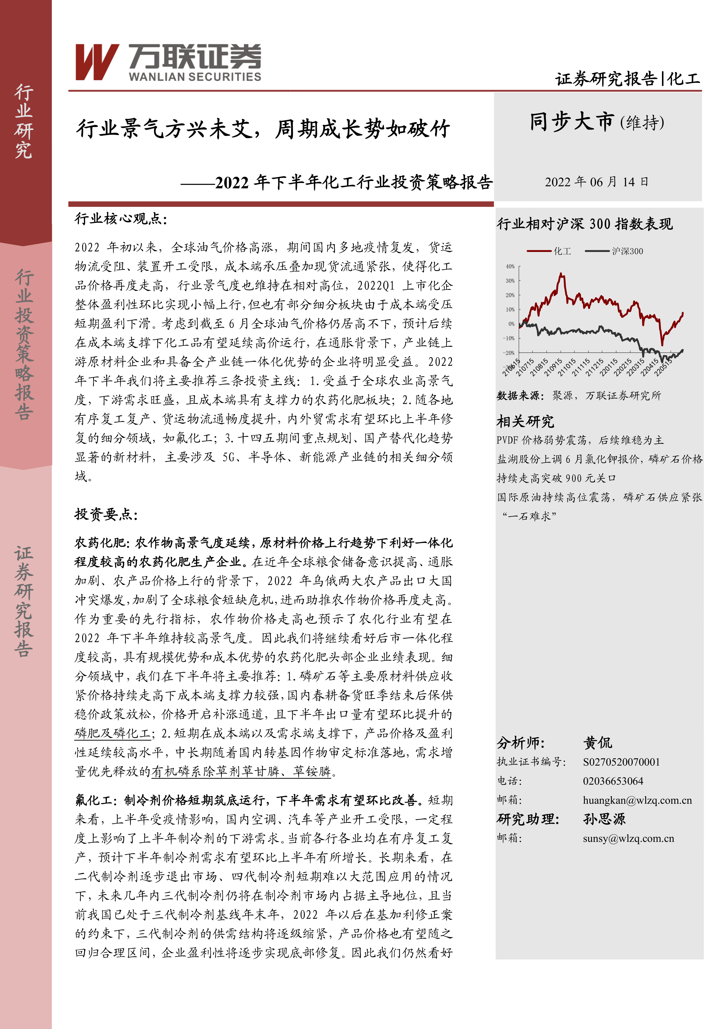 本报告的核心观点是:2022年下半年化工行业景气度将维持高位,周期成长势如破竹。主要受益于全球油气价格高涨、农产品价格上行以及核心产业国产替代趋势。报告推荐三条投资主线: