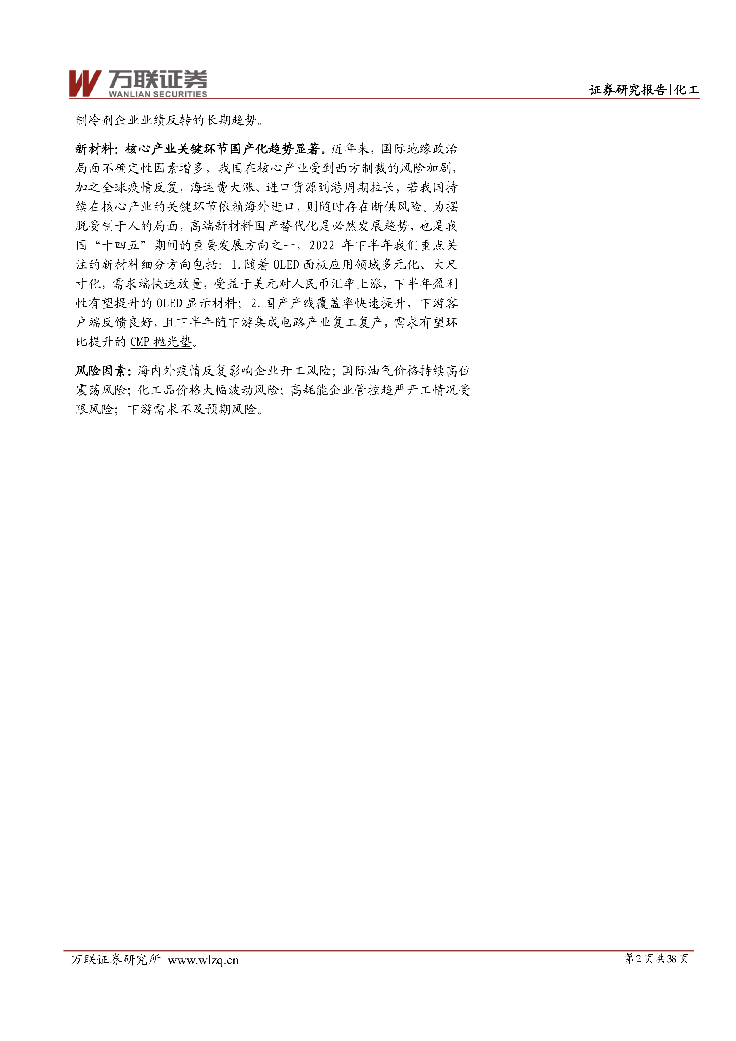 氟化工:制冷剂价格短期筑底运行,下半年需求有望环比改善。 短期来看, 上半年受疫情影响,国内空调、汽车等产业开工受限,一定程度上影响了上半年制冷剂的下游需求。当前各行各业均在有序复工复产,预计下半年制冷剂需求有望环比上半年有所增长。长期来看,在二代制冷剂逐步退出市场、四代制冷剂短期难以大范围应用的情况下,未来几年内三代制冷剂仍将在制冷剂市场内占据主导地位,且当前我国已处于三代制冷剂基线年末年,2022 年以后在基加利修正案的约束下,三代制冷剂的供需结构将逐级缩紧,产品价格也有望随之回归合理区间,企业盈利性将逐步实现底部修复。因此我们仍然看好制冷剂企业业绩反转的长期趋势。新材料:核心产业关键环节国产化趋势显著。 近年来, 国际地缘政治局面不确定性因素增多,我国在核心产业受到西方制裁的风险加剧,加之全球疫情反复,海运费大涨、进口货源到港周期拉长,若我国持续在核心产业的关键环节依赖海外进口,则随时存在断供风险。为摆脱受制于人的局面,高端新材料国产替代化是必然发展趋势,也是我国“十四五”期间的重要发展方向之一,2022 年下半年我们重点关注的新材料细分方向包括:1.随着 OLED 面板应用领域多元化、大尺寸化,需求端快速放量,受益于美元对人民币汇率上涨,下半年盈利性有望提升的 OLED 显示材料;2.国产产线覆盖率快速提升,下游客户端反馈良好,且下半年随下游集成电路产业复工复产,需求有望环比提升的 CMP 抛光垫。