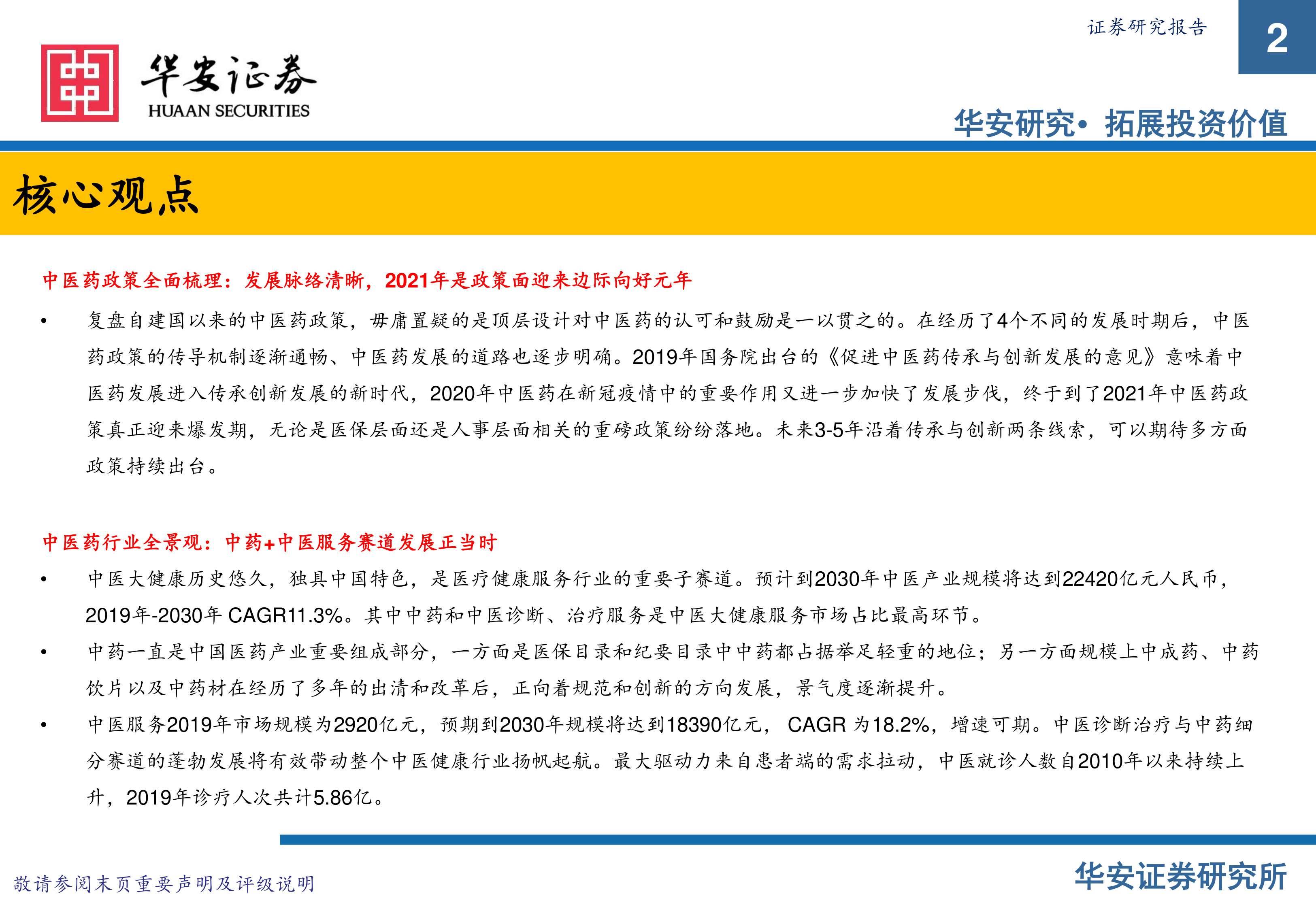本报告的核心观点是:中医药行业在政策利好和市场需求的双重驱动下,迎来新的发展机遇。报告重点分析了中医药政策的演变、行业全景、市场行情以及未来发展趋势,并推荐了在中药创新药、品牌中药、中医服务和中药配方颗粒四个赛道上的优质投资标的。