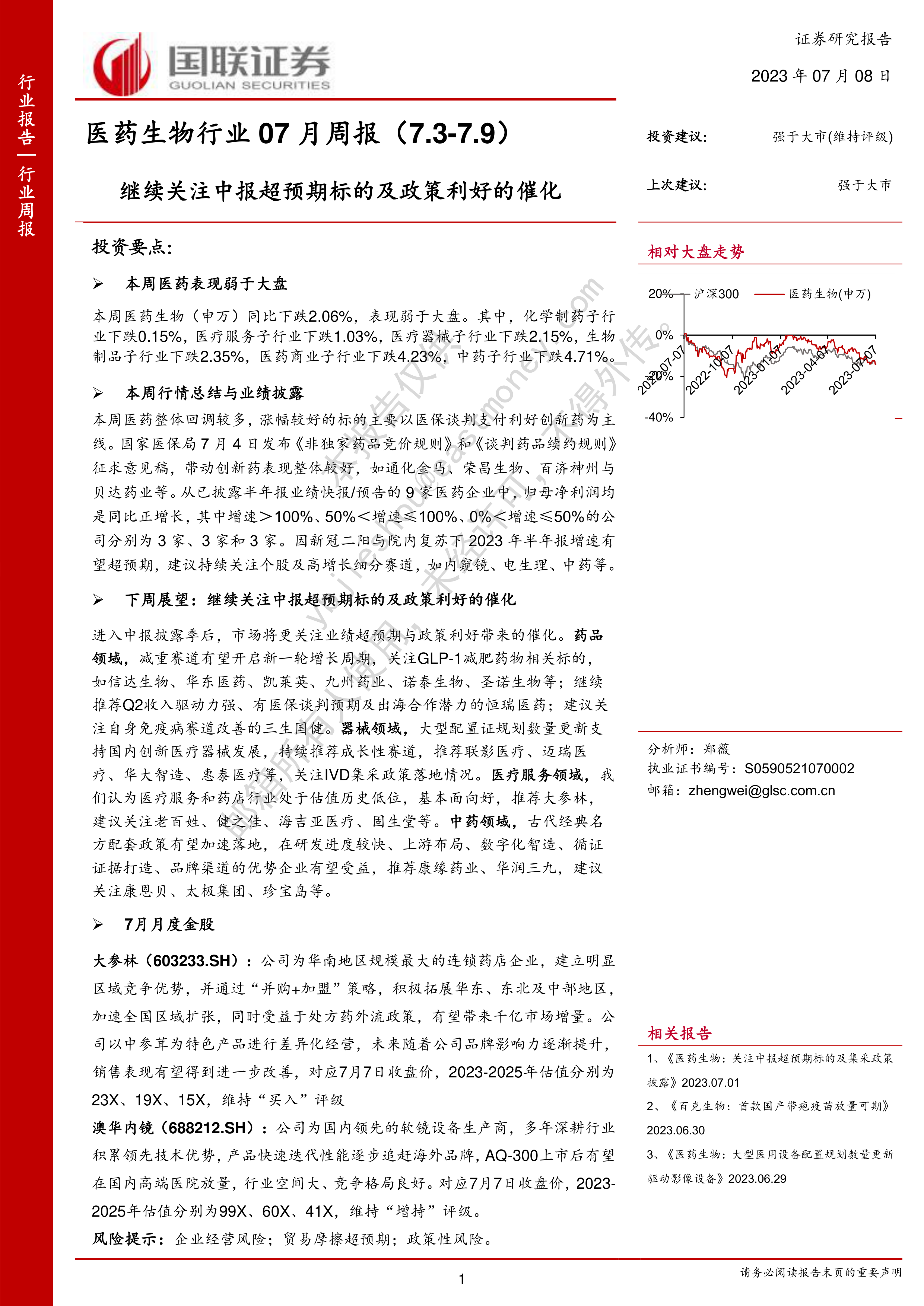 进入中报披露季后, 市场将更关注业绩超预期与政策利好带来的催化。 药品领域, 减重赛道有望开启新一轮增长周期,关注GLP-1减肥药物相关标的,如信达生物、华东医药、 凯莱英、九州药业、诺泰生物、圣诺生物等; 继续推荐Q2收入驱动力强、有医保谈判预期及出海合作潜力的恒瑞医药; 建议关注自身免疫病赛道改善的三生国健。 器械领域, 大型配置证规划数量更新支持国内创新医疗器械发展,持续推荐成长性赛道,推荐联影医疗、迈瑞医疗、华大智造、惠泰医疗等,关注IVD集采政策落地情况。 医疗服务领域, 我们认为医疗服务和药店行业处于估值历史低位,基本面向好,推荐大参林,建议关注老百姓、健之佳、海吉亚医疗、固生堂等。 中药领域, 古代经典名方配套政策有望加速落地, 在研发进度较快、上游布局、数字化智造、循证证据打造、品牌渠道的优势企业有望受益,推荐康缘药业、华润三九,建议关注康恩贝、太极集团、珍宝岛等。