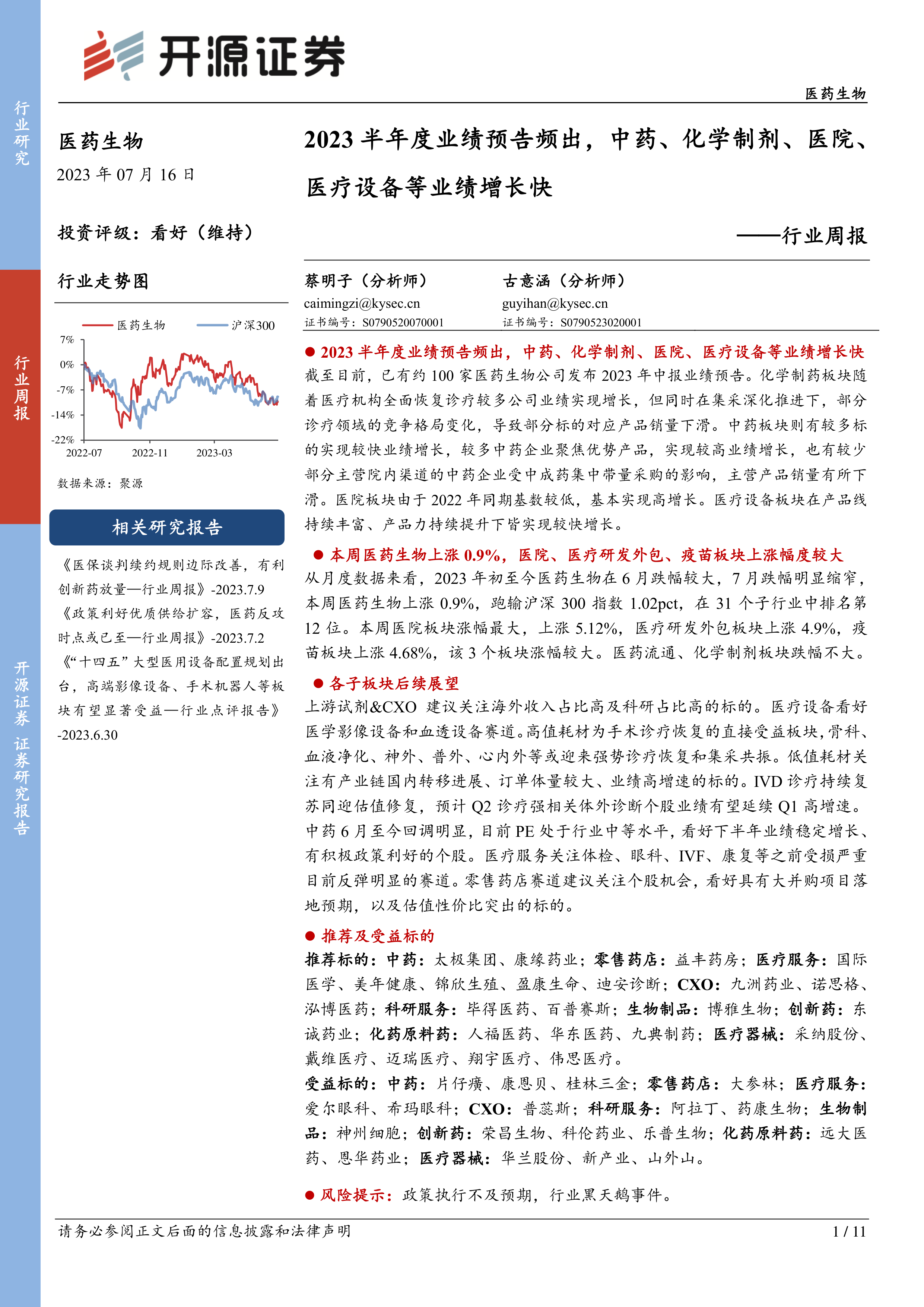 2023半年度业绩预告频出,中药、化学制剂、医院、医疗设备等业绩增长快