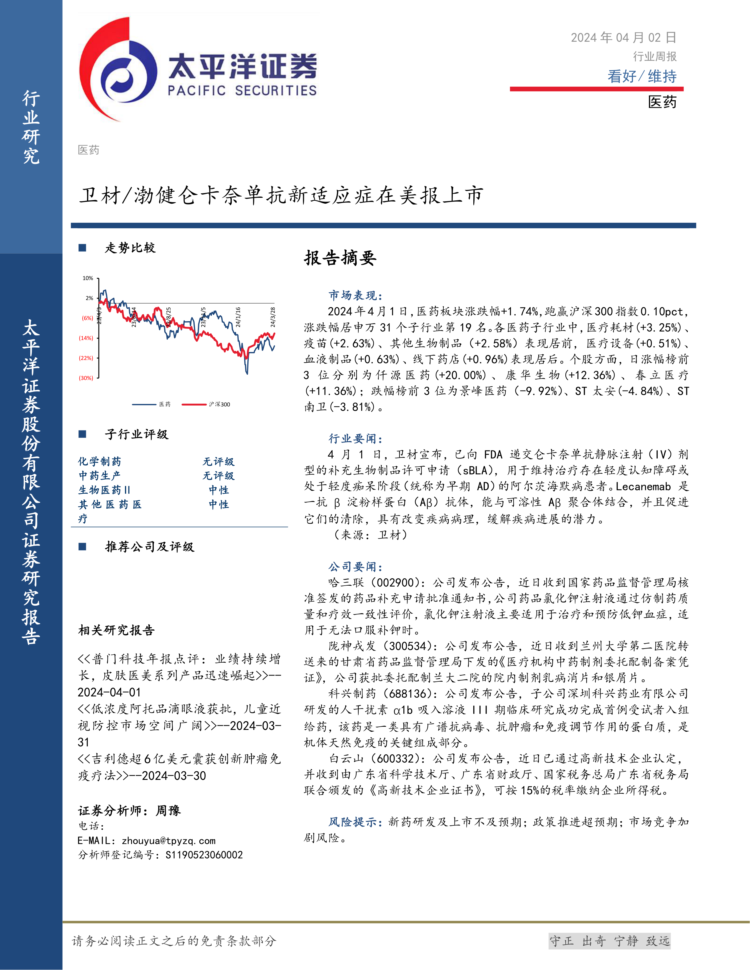 本报告的核心观点是:2024年4月2日医药行业整体表现略微上涨,但涨幅有限,个股表现分化明显。 阿尔茨海默病治疗药物仑卡奈单抗新适应症的申报为行业带来利好消息,但整体市场仍面临新药研发及上市不及预期、政策推进超预期以及市场竞争加剧等风险。
