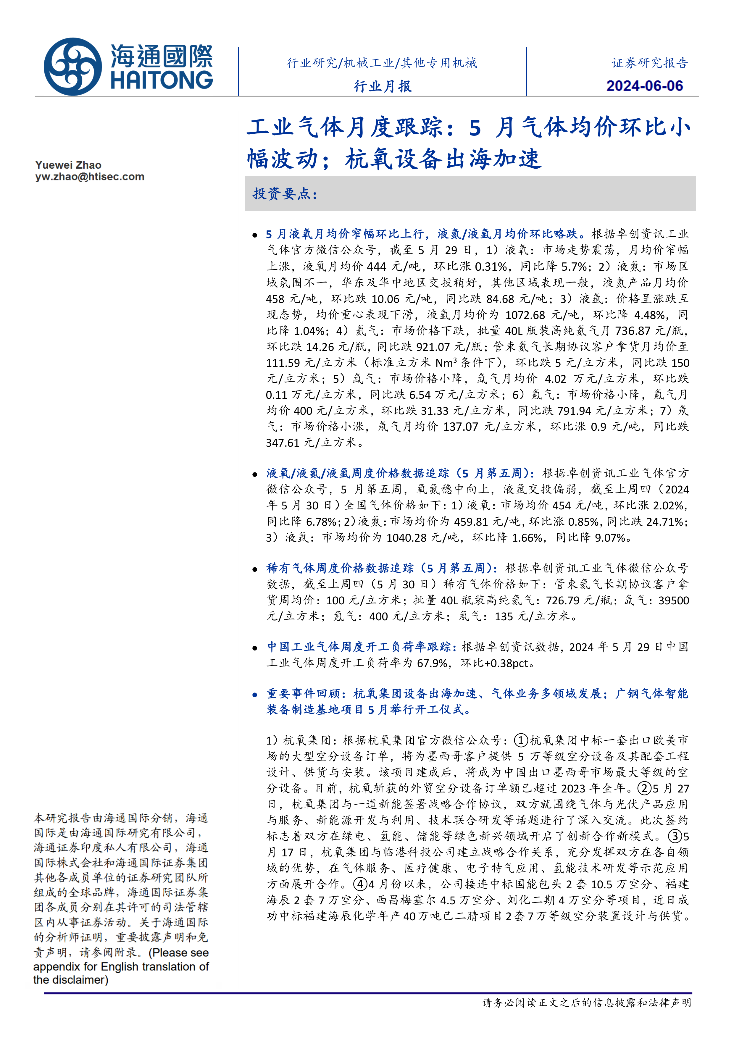 工业气体月度跟踪:5月气体均价环比小幅波动;杭氧设备出海加速