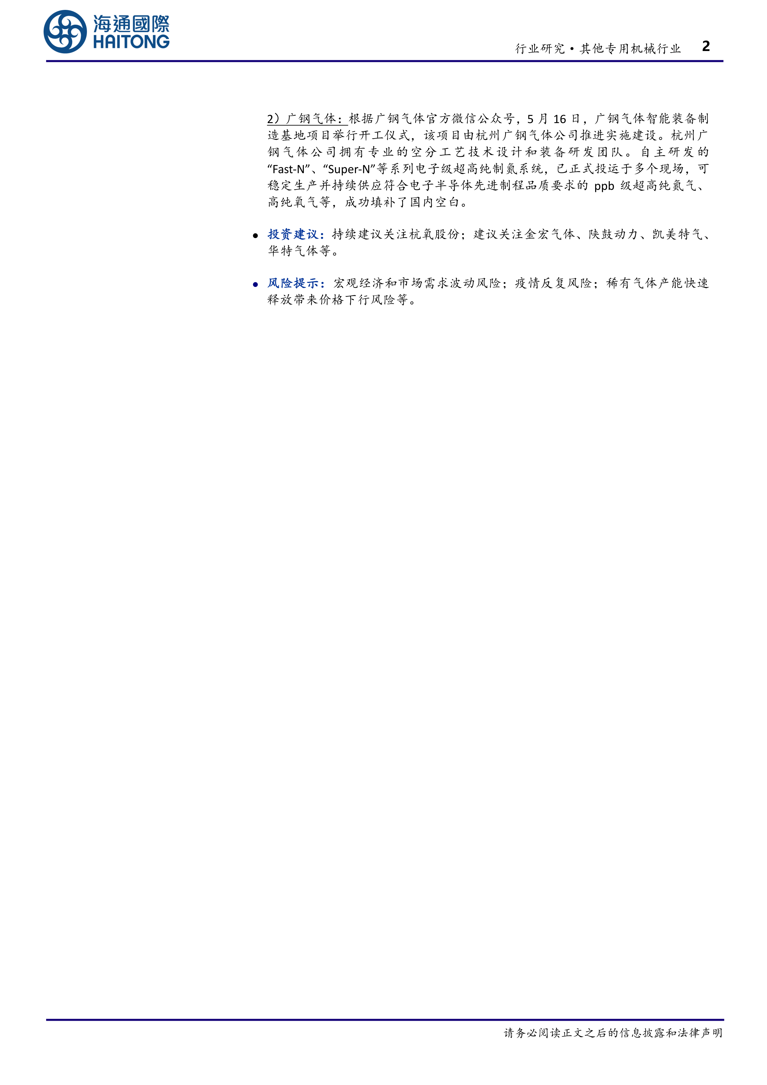 报告建议持续关注杭氧股份,并建议关注金宏气体、陕鼓动力、凯美特气、华特气体等公司。 同时,报告也提示了宏观经济和市场需求波动风险、疫情反复风险以及稀有气体产能快速释放带来价格下行风险等潜在风险。