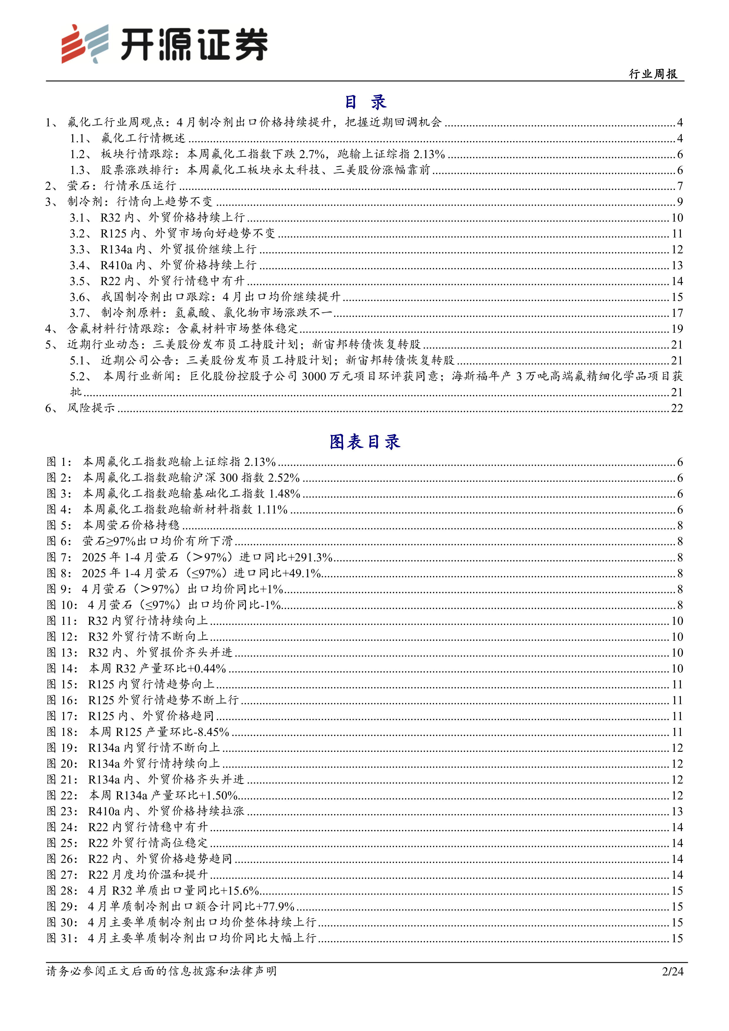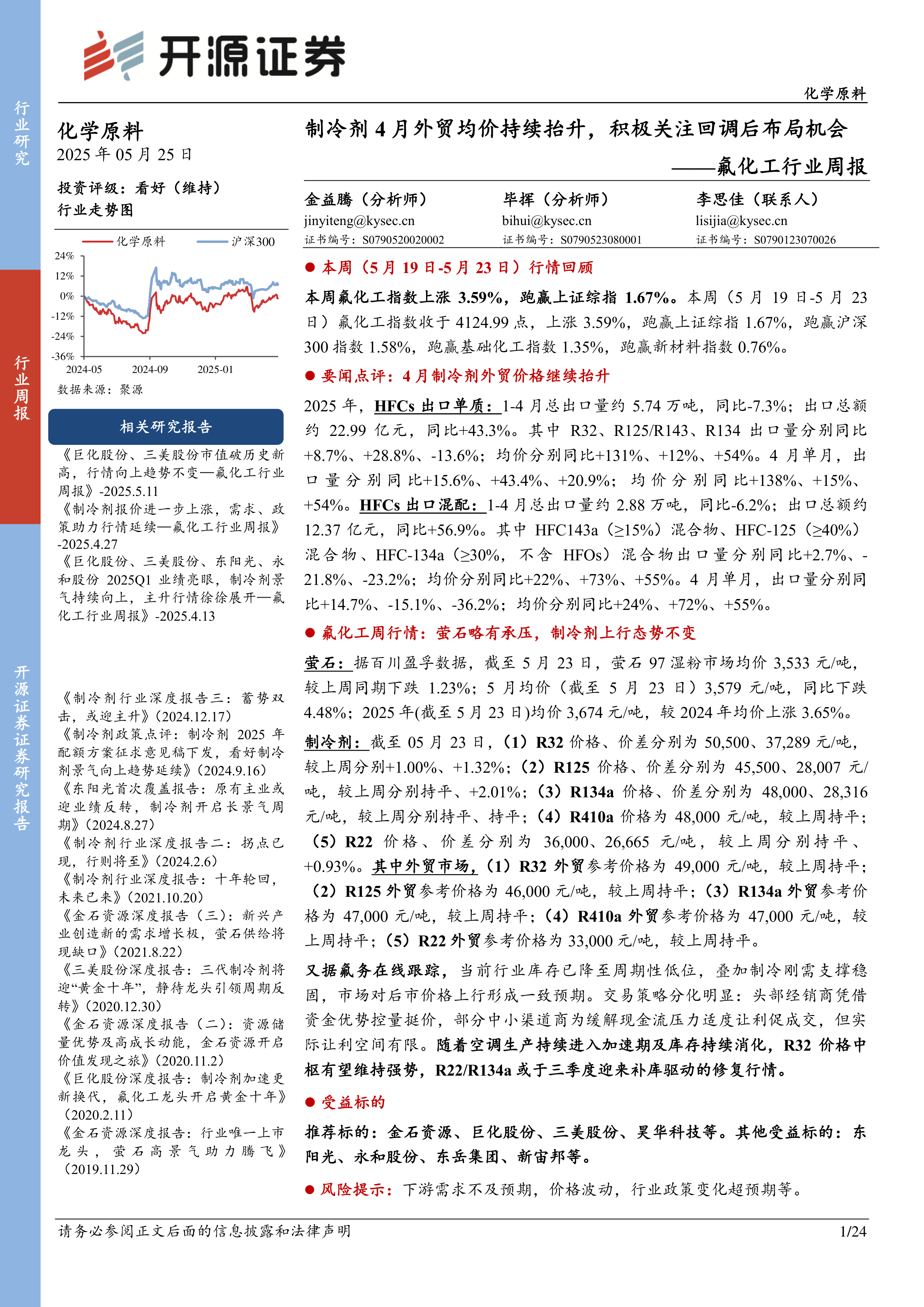 本报告对2025年5月25日氟化工行业,特别是制冷剂和萤石市场进行了数据驱动型分析。4月份制冷剂出口价格持续上涨,显示出市场强劲的需求和良好的发展前景,但萤石价格承压运行,提示市场存在一定波动风险。 报告建议投资者关注市场回调后的布局机会,并看好氟化工行业长期发展,推荐了部分相关上市公司。 报告还提供了丰富的图表数据,方便投资者更直观地了解市场动态。 需要注意的是,报告中的分析基于各种假设,估值结果不保证所涉及证券能够在该价格交易,投资者应谨慎决策。