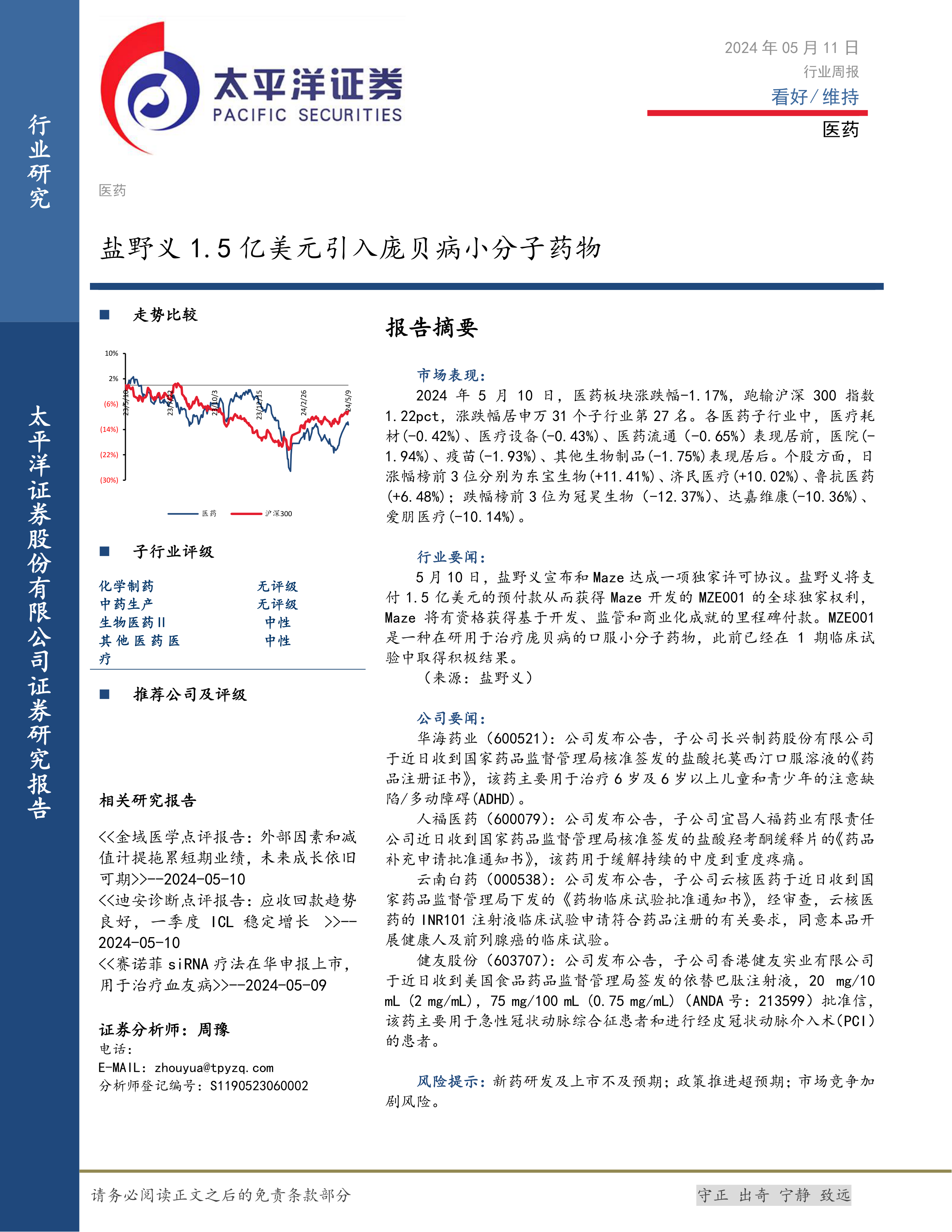 本报告对2024年5月11日医药行业进行了全面分析,指出行业整体表现平稳,但子行业和个股表现分化明显。盐野义引进庞贝病小分子药物以及多家公司在药品研发和注册方面的进展,展现了行业发展潜力。然而,投资者需关注新药研发风险、政策风险和市场竞争风险。 报告提供的市场数据和公司动态分析,为投资者提供参考,但不能作为投资决策的唯一依据。 投资者应结合自身风险承受能力和投资目标,进行独立判断和决策。