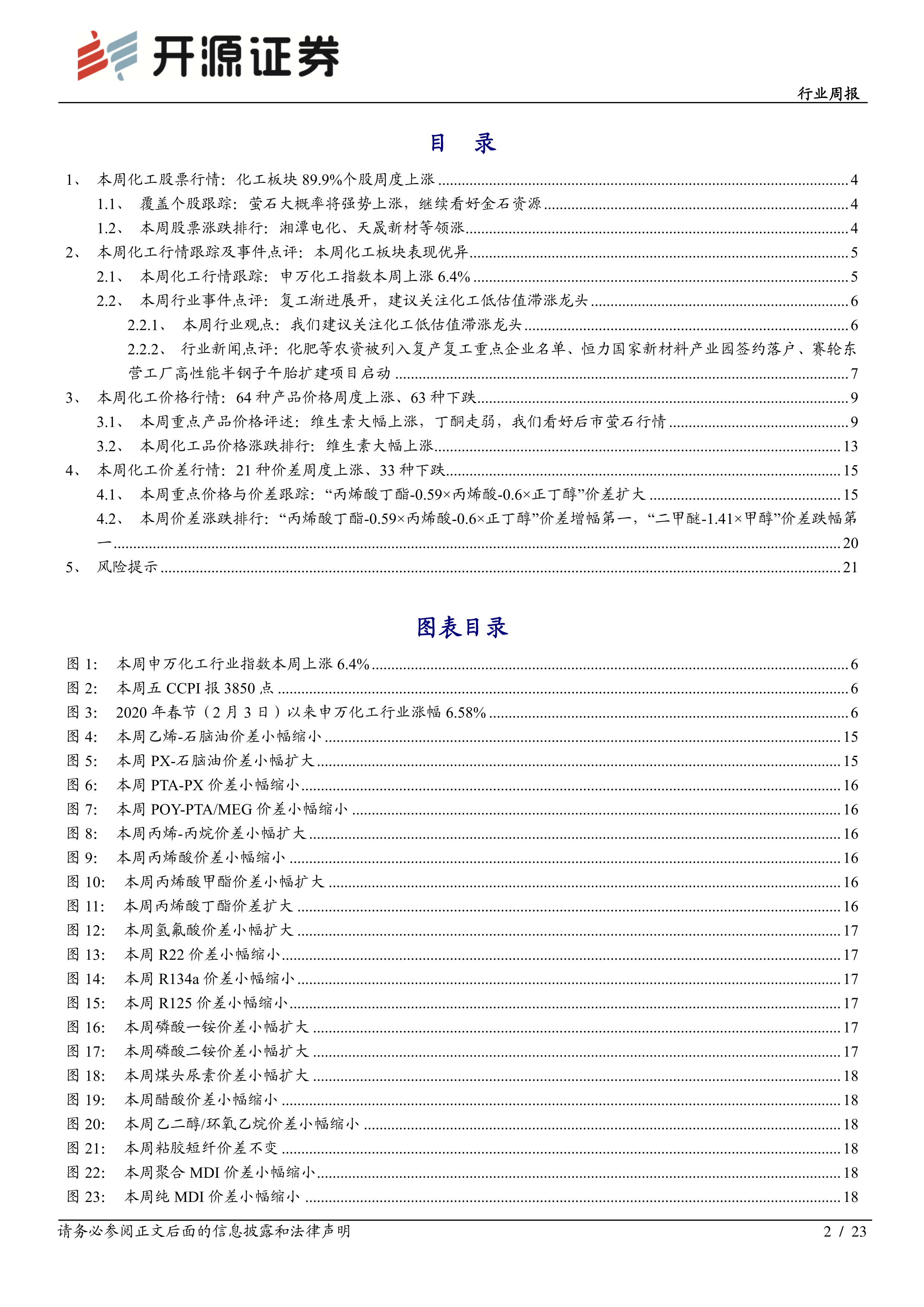 报告对本周化工行情进行了跟踪,数据显示申万化工指数本周上涨6.4%,跑赢沪深300指数2.37%。报告还对本周行业事件进行了点评,包括:宏观层面多措并举推进有序复工,化肥等农资被列入复产复工重点企业名单,保障春耕备耕,赛轮东营工厂高性能半钢子午胎扩建项目启动,以及恒力国家新材料产业园签约落户等。这些事件都对化工行业复苏和发展起到积极作用。