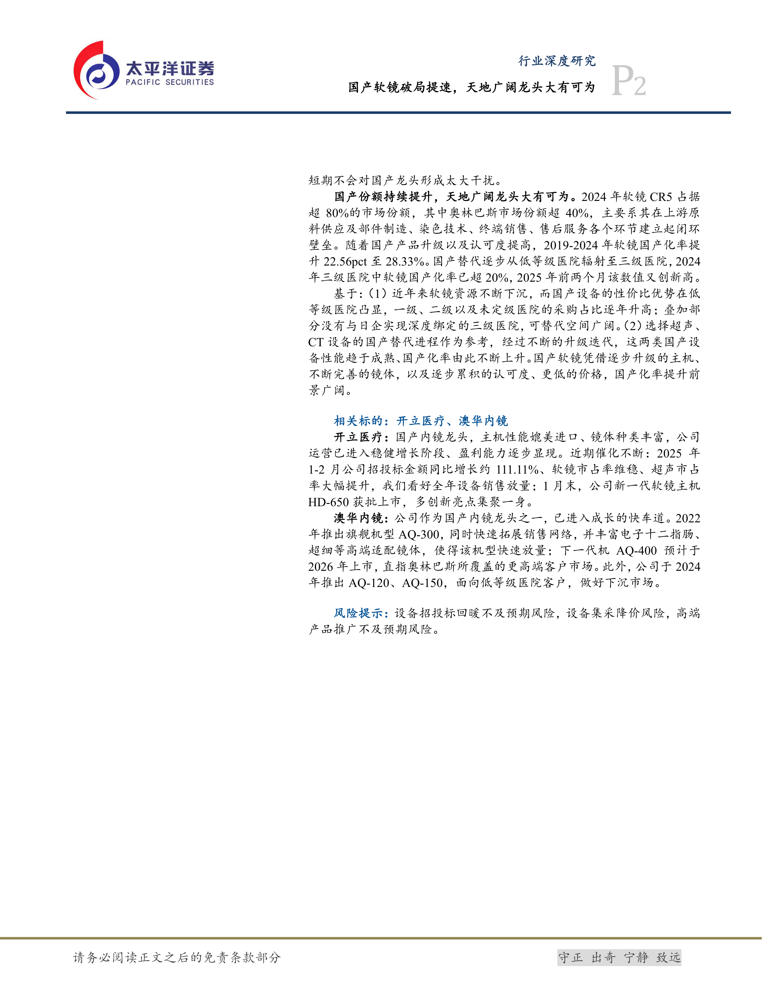 国产份额持续提升,天地广阔龙头大有可为。2024年软镜CR5占据超80%的市场份额,其中奥林巴斯市场份额超40%,主要系其在上游原料供应及部件制造、染色技术、终端销售、售后服务各个环节建立起闭环壁垒。随着国产产品升级以及认可度提高,2019-2024年软镜国产化率提升22.56pct至28.33%。国产替代逐步从低等级医院辐射至三级医院,2024年三级医院中软镜国产化率已超20%,2025年前两个月该数值又创新高。