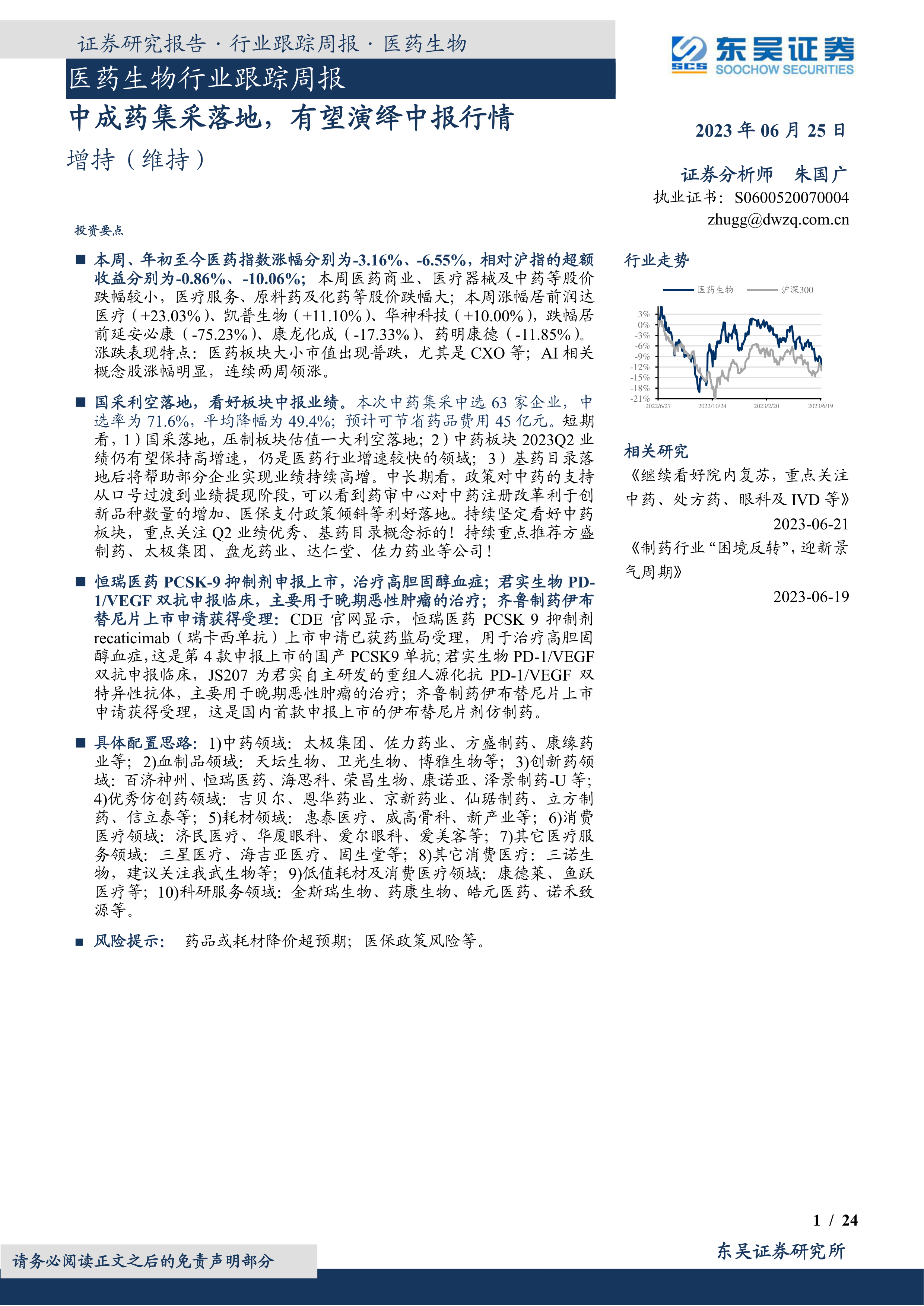 国采利空落地,看好板块中报业绩。本次中药集采中选63家企业,中选率为71.6%,平均降幅为49.4%;预计可节省药品费用45亿元。短期看,1)国采落地,压制板块估值一大利空落地;2)中药板块2023Q2业绩仍有望保持高增速,仍是医药行业增速较快的领域;3)基药目录落地后将帮助部分企业实现业绩持续高增。中长期看,政策对中药的支持从口号过渡到业绩提现阶段,可以看到药审中心对中药注册改革利于创新品种数量的增加、医保支付政策倾斜等利好落地。持续坚定看好中药板块,重点关注Q2业绩优秀、基药目录概念标的!持续重点推荐方盛制药、太极集团、盘龙药业、达仁堂、佐力药业等公司!