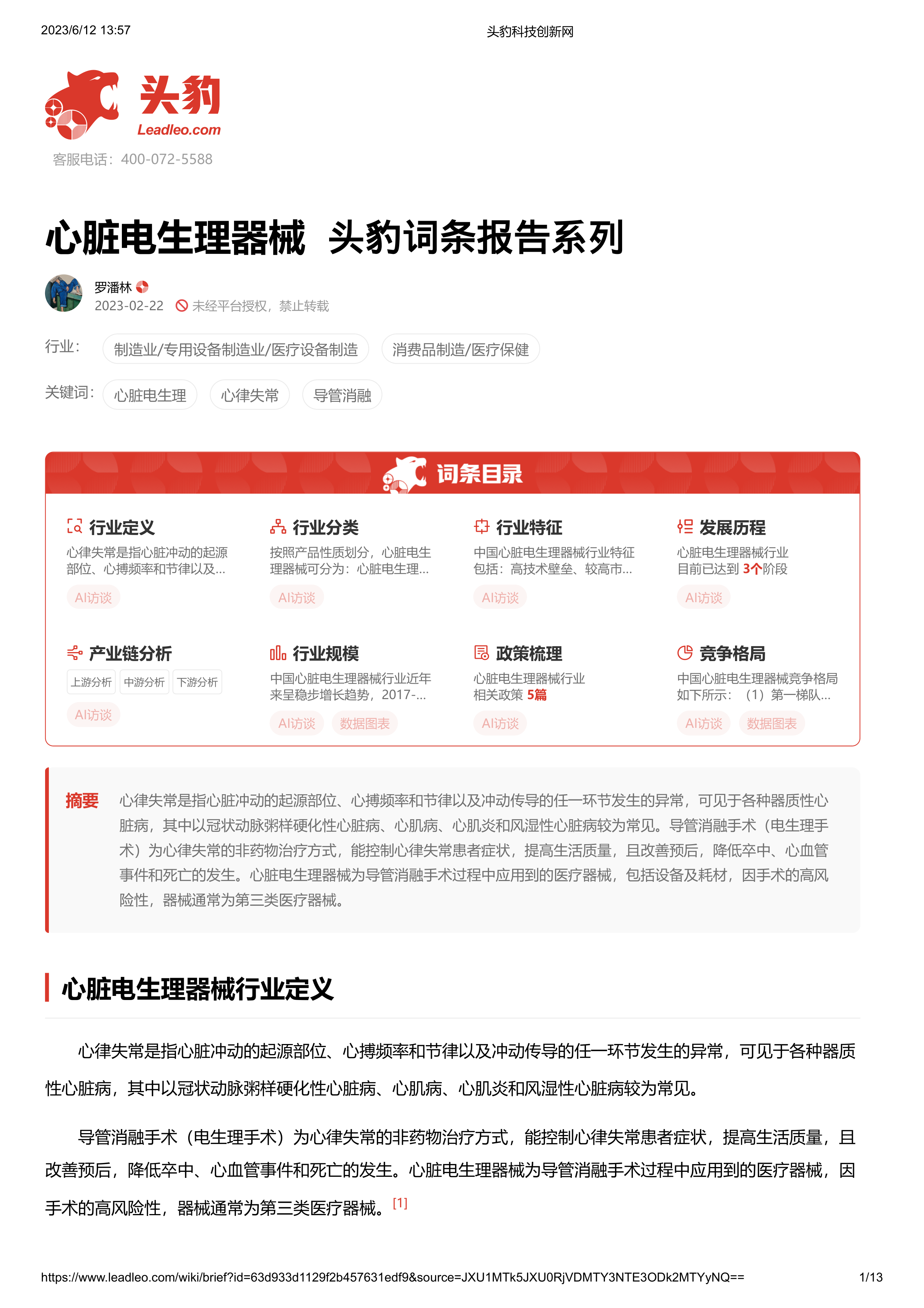 本报告基于头豹科技创新网发布的《心脏电生理器械》词条报告,对中国心脏电生理器械行业进行市场分析。报告核心观点如下: