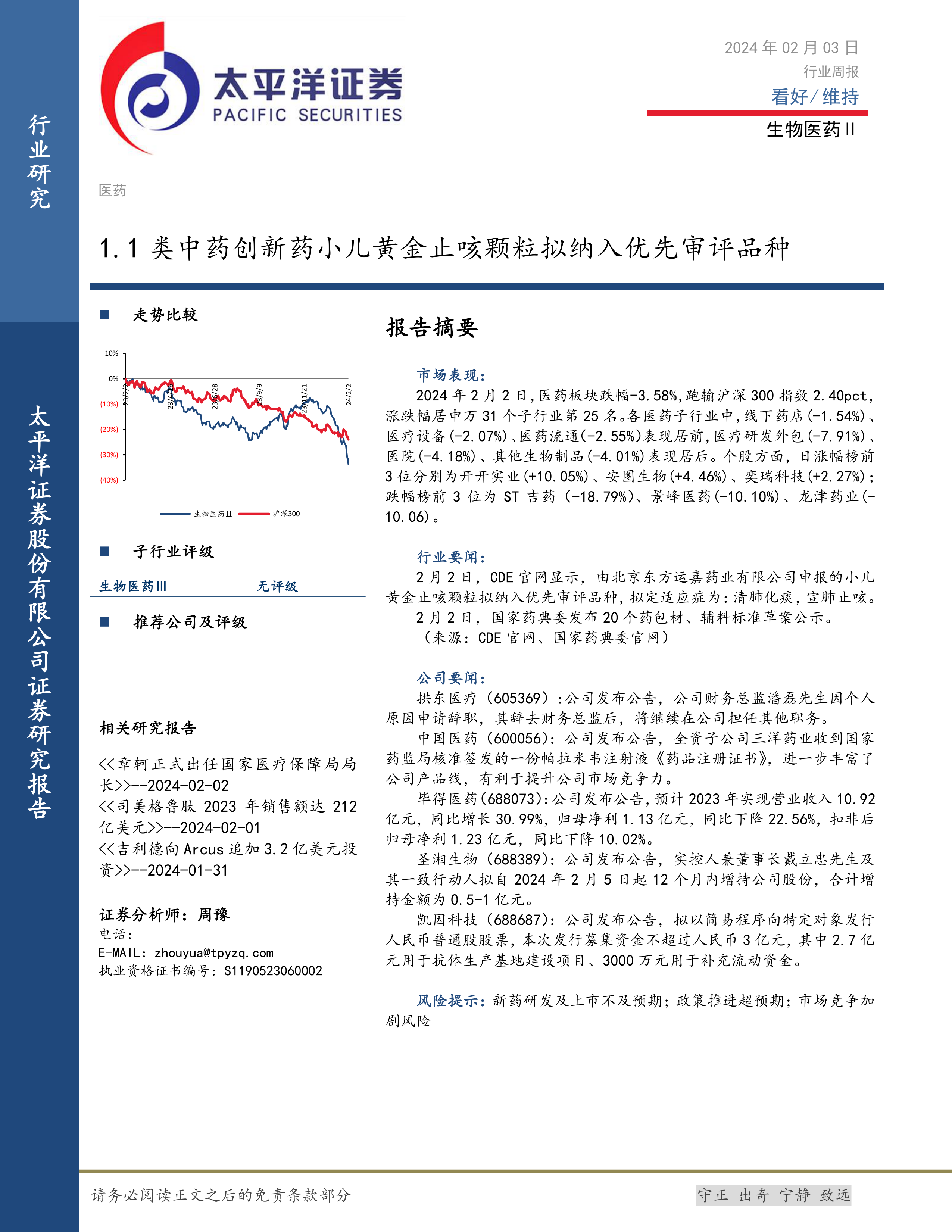 本报告的核心观点是:2024年2月3日,生物医药Ⅱ行业整体表现下跌,但个股表现分化明显。小儿黄金止咳颗粒拟纳入优先审评品种,对中药创新药市场带来积极影响。部分公司发布了业绩公告和增持计划,反映出市场存在一定程度的积极预期,但整体行业仍面临新药研发及上市不及预期、政策推进超预期以及市场竞争加剧等风险。