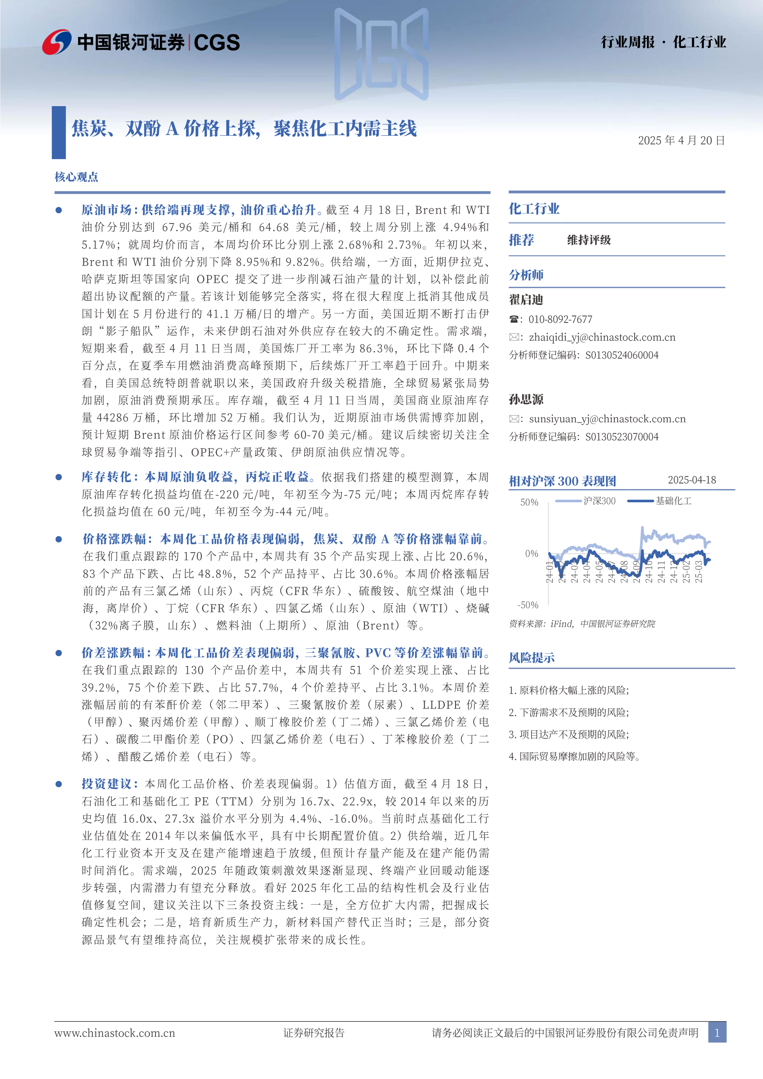 投资建议:本周化工品价格、价差表现偏弱。1)估值方面,截至4月18日,石油化工和基础化工PE(TTM)分别为16.7x、22.9x,较2014年以来的历史均值16.0x、27.3x溢价水平分别为4.4%、-16.0%。当前时点基础化工行业估值处在2014年以来偏低水平,具有中长期配置价值。2)供给端,近几年七工行业资本开支及在建产能增速趋于放缓,但预计存量产能及在建产能仍需时间消化。需求端,2025年随政策刺激效果逐渐显现、终端产业回暖动能逐步转强,内需潜力有望充分释放。看好2025年化工品的结构性机会及行业估值修复空间,建议关注以下三条投资主线:一是,全方位扩大内需,把握成长确定性机会;二是,培育新质生产力,新材料国产替代正当时;三是,部分资源品景气有望维持高位,关注规模扩张带来的成长性。