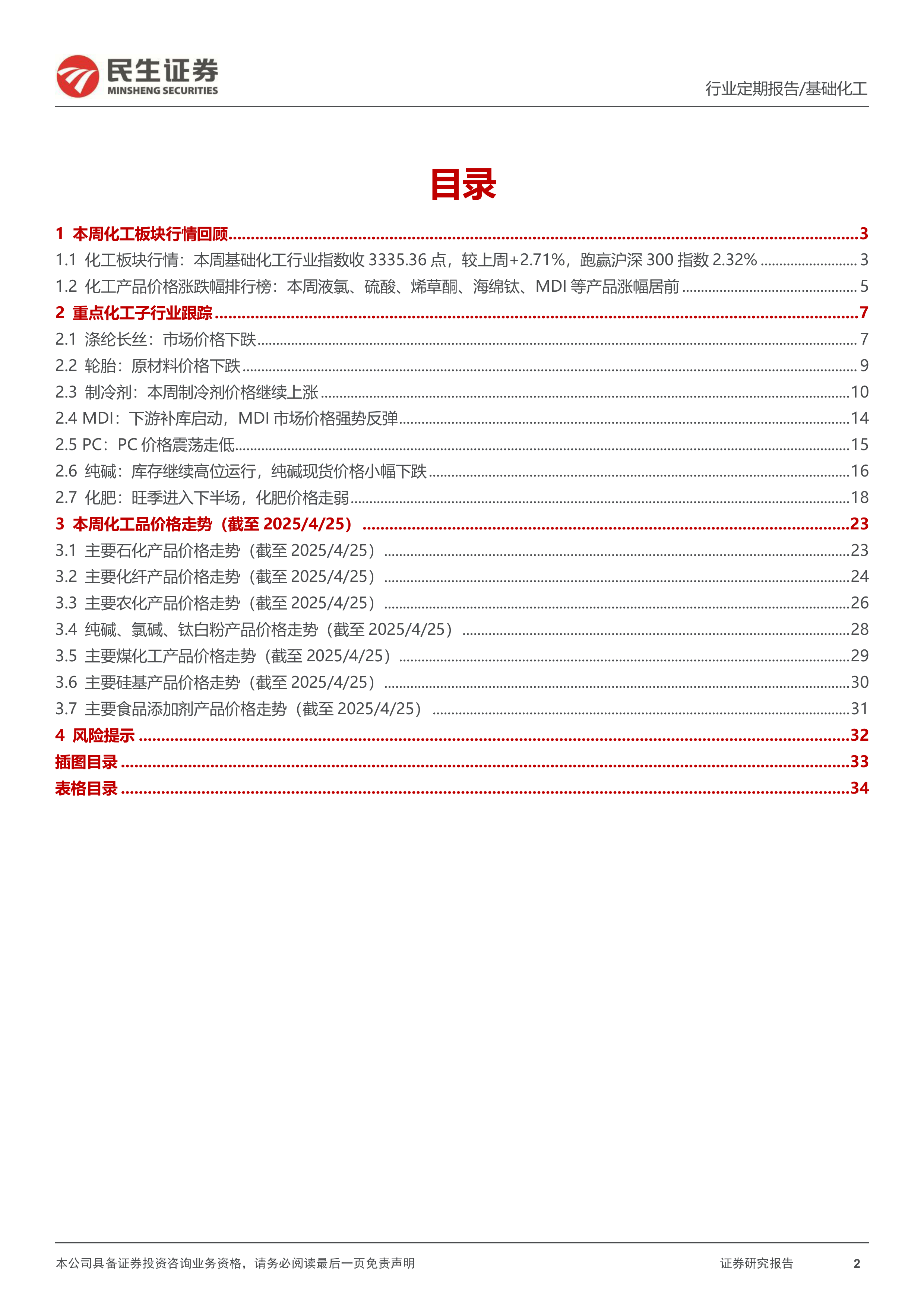 报告详细跟踪分析了涤纶长丝、轮胎、制冷剂、MDI、PC、纯碱、化肥等七个重点化工子行业。