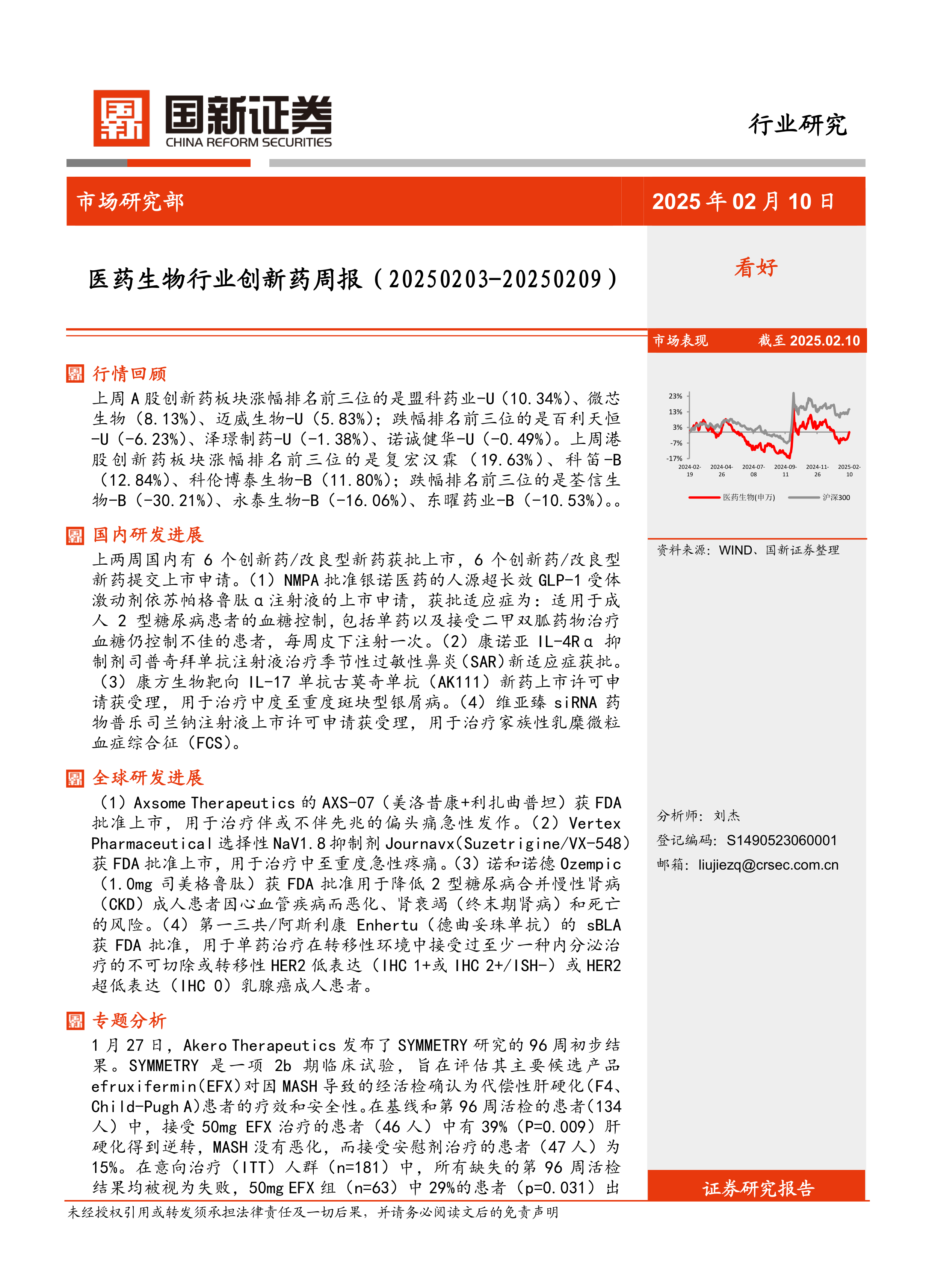 本报告对2025年2月3日至2025年2月9日期间创新药行业的市场表现、国内外研发进展以及FGF21类似物在NASH治疗领域的研发情况进行了分析。报告指出,创新药行业发展迅速,市场表现波动较大,国内外研发进展均值得关注。FGF21类似物在NASH治疗领域展现出巨大潜力,但同时也面临着激烈的竞争。投资者需关注政策风险、市场竞争以及研发进展等因素。 未来报告可以补充更详细的数据和更深入的分析,以提高报告的实用性和参考价值。 例如,可以加入对市场规模预测、竞争格局分析以及投资建议等内容。
