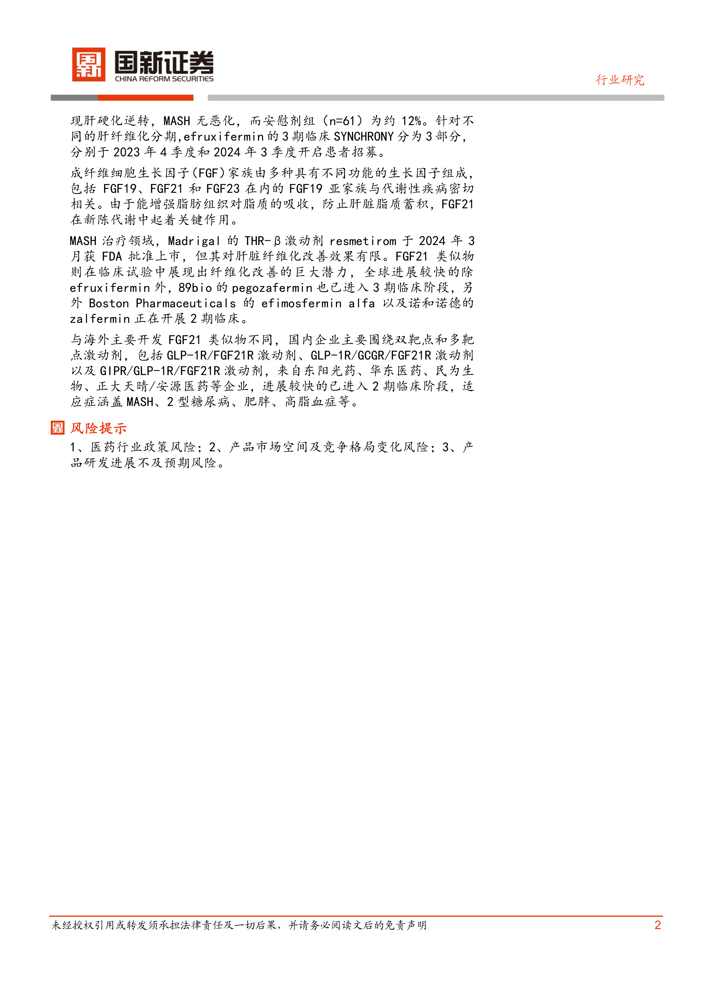 本报告的核心观点是:创新药行业发展迅速,市场表现波动较大,国内外研发进展均值得关注。国内创新药研发主要集中在双靶点和多靶点激动剂,而国外则在单靶点药物方面取得显著进展。FGF21类似物在非酒精性脂肪性肝炎(NASH)治疗领域展现出巨大潜力,成为行业关注焦点。