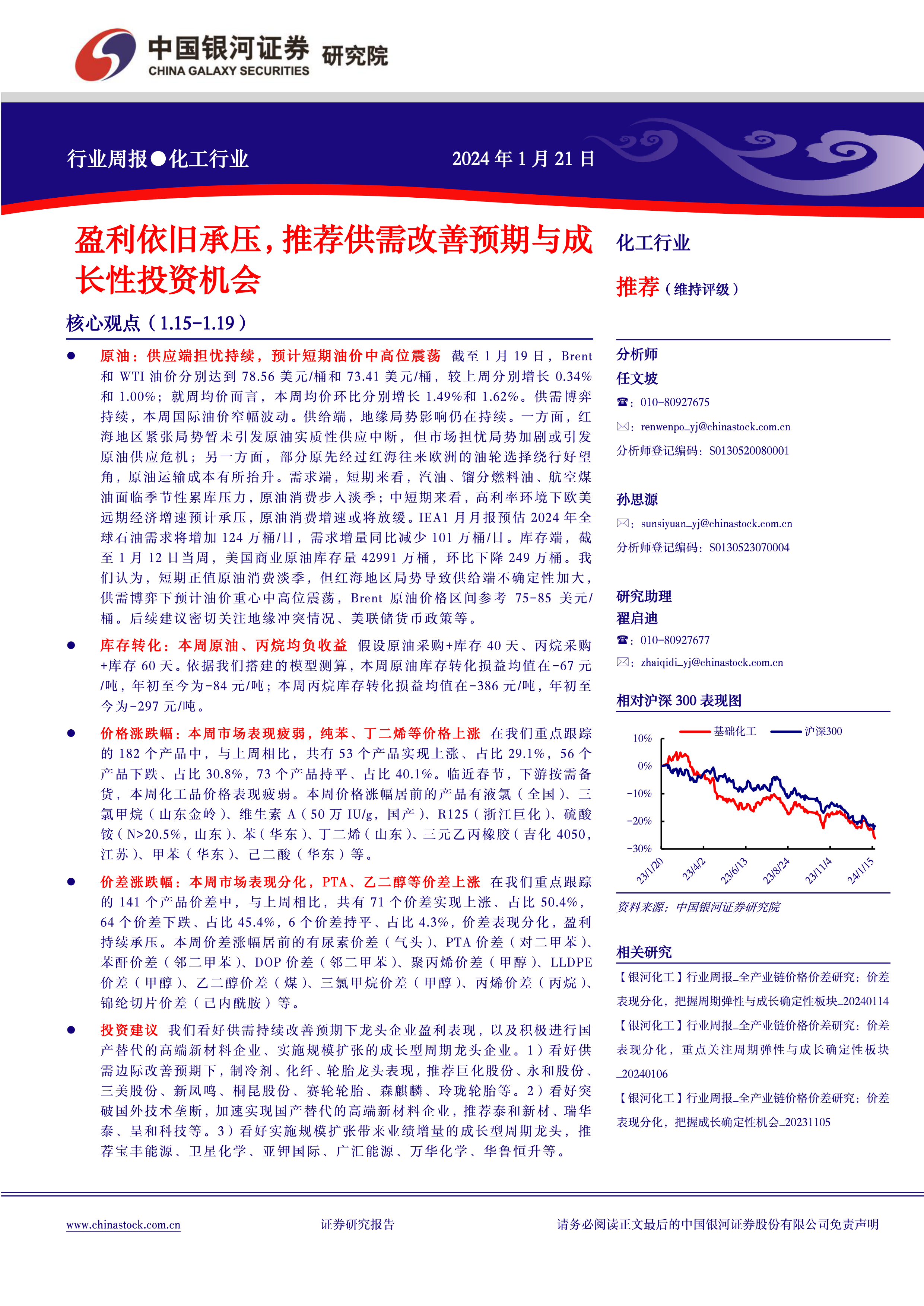 本报告的核心观点是化工行业盈利依旧承压,但部分细分领域存在供需改善预期和长期投资机会。报告基于对国际油价、化工品价格、价差以及库存转化的分析,推荐了在供需改善预期下具有盈利增长潜力的龙头企业,以及在国产替代和规模扩张方面具有成长确定性的企业。