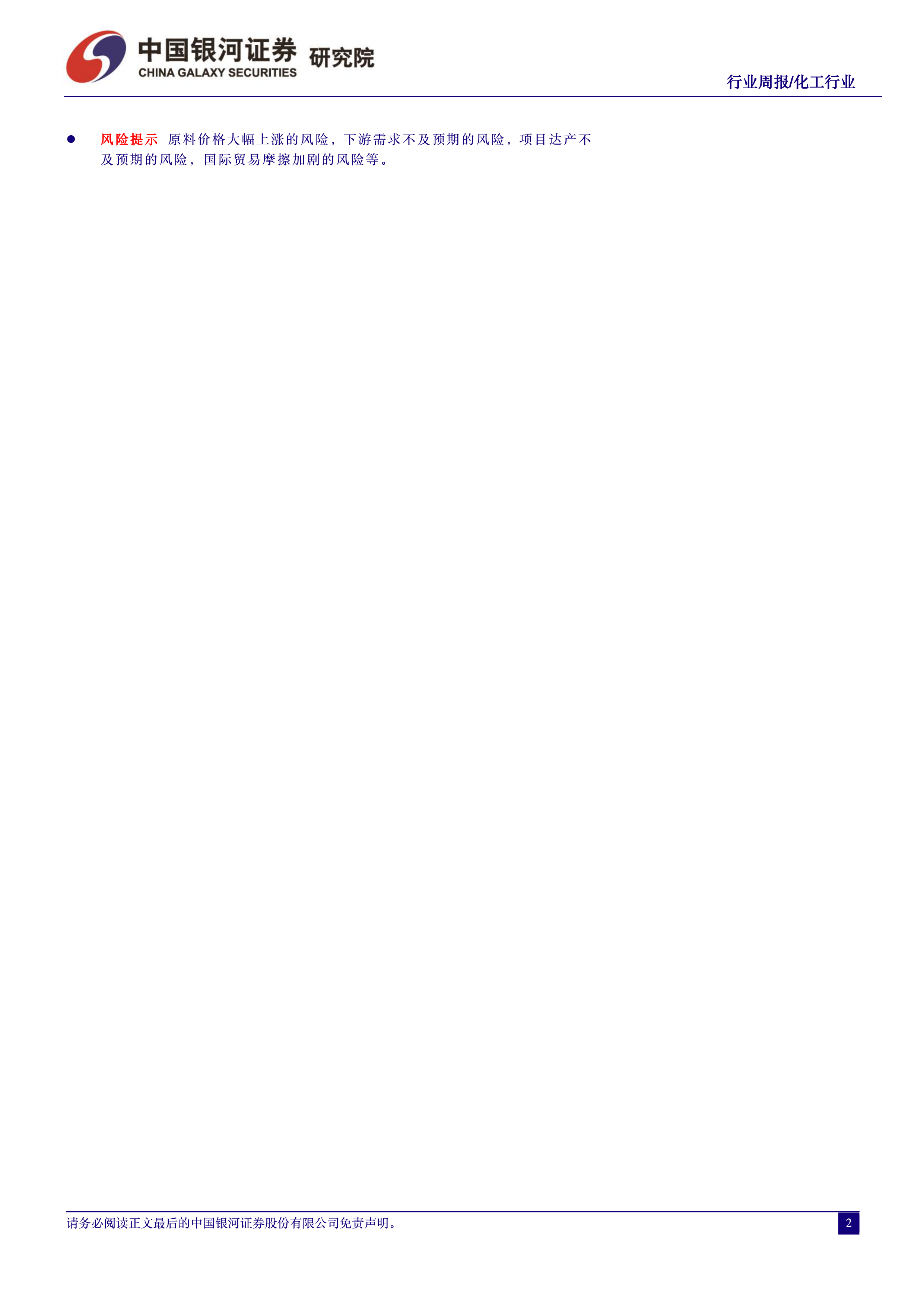 风险提示原料价格大幅上涨的风险,下游需求不及预期的风险,项目达产不及预期的风险,国际贸易摩擦加剧的风险等。
