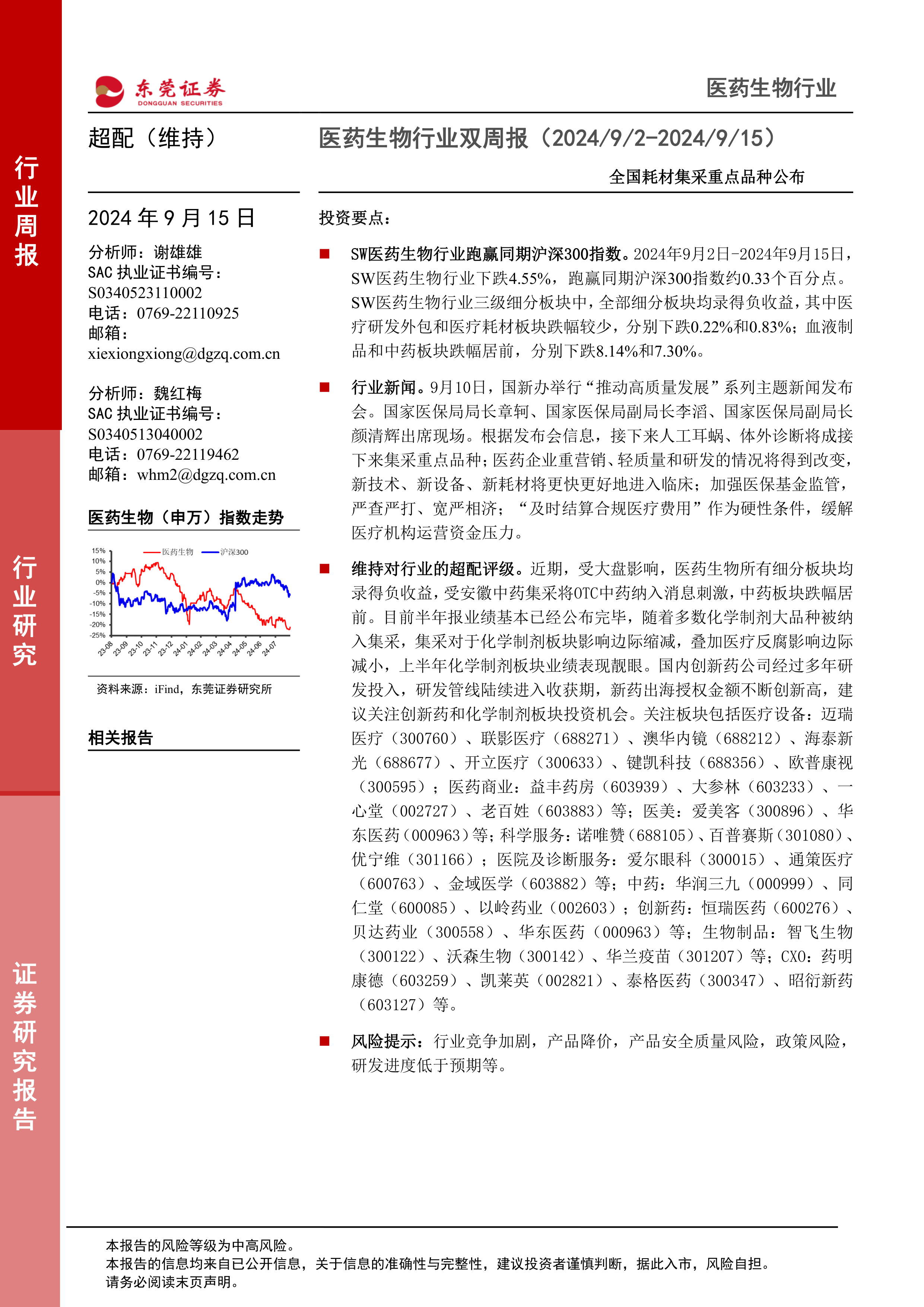 本报告的核心观点是:尽管2024年9月2日至15日SW医药生物行业整体下跌4.55%,但跑赢同期沪深300指数0.33个百分点。所有细分板块均录得负收益,但医疗研发外包和医疗耗材板块跌幅最小;中药和血液制品板块跌幅最大。 尽管短期市场表现受大盘影响,但基于半年报业绩及创新药研发进展,维持对医药生物行业的超配评级,并建议关注创新药和化学制剂板块的投资机会。报告同时指出行业面临政策风险、研发风险、产品质量风险等。