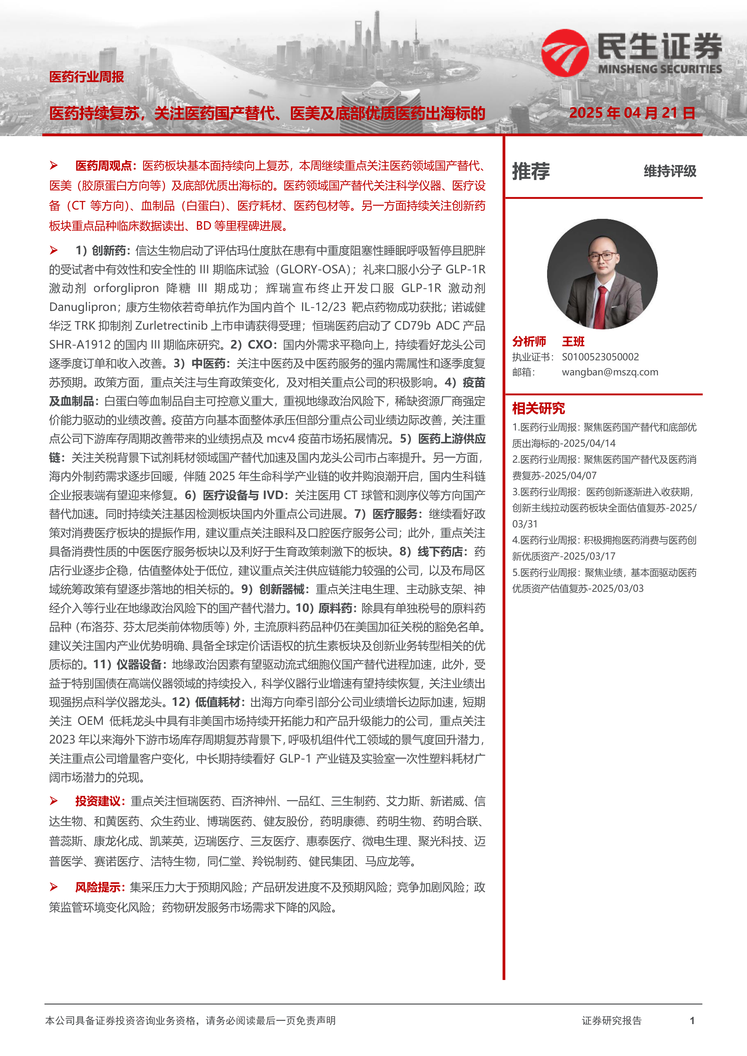1)创新药:信达生物启动了评估玛仕度肽在患有中重度阻塞性睡眠呼吸暂停且肥胖的受试者中有效性和安全性的III期临床试验(GLORY-OSA);礼来口服小分子GLP-1R激动剂orforglipron降糖III期成功;辉瑞宣布终止开发口服GLP-1R激动剂Danuglipron;康方生物依若奇单抗作为国内首个IL-12/23靶点药物成功获批;诺诚健华泛TRK抑制剂Zurletrectinib上市申请获得受理;恒瑞医药启动了CD79b ADC产品SHR-A1912的国内III期临床研究。2)CXO:国内外需求平稳向上,持续看好龙头公司逐季度订单和收入改善。3)中医药:关注中医药及中医药服务的强内需属性和逐季度复苏预期。政策方面,重点关注与生育政策变化,及对相关重点公司的积极影响。4)疫苗及血制品:白蛋白等血制品自主可控意义重大,重视地缘政治风险下,稀缺资源厂商强定价能力驱动的业绩改善。疫苗方向基本面整体承压但部分重点公司业绩边际改善,关注重点公司下游库存周期改善带来的业绩拐点及mcv4疫苗市场拓展情况。5)医药上游供应链:关注关税背景下试剂耗材领域国产替代加速及国内龙头公司市占率提升。另一方面,海内外制药需求逐步回暖,伴随2025年生命科学产业链的收并购浪潮开启,国内生科链企业报表端有望迎来修复。6)医疗设备与IVD:关注医用CT球管和测序仪等方向国产替代加速。同时持续关注基因检测板块国内外重点公司进展。7)医疗服务:继续看好政策对消费医疗板块的提振作用,建议重点关注眼科及口腔医疗服务公司;此外,重点关注具备消费性质的中医医疗服务板块以及利好于生育政策刺激下的板块。8)线下药店:药店行业逐步企稳,估值整体处于低位,建议重点关注供应链能力较强的公司,以及布局区域统筹政策有望逐步落地的相关标的。9)创新器械:重点关注电生理、主动脉支架、神经介入等行业在地缘政治风险下的国产替代潜力。10)原料药:除具有单独税号的原料药品种(布洛芬、芬太尼类前体物质等)外,主流原料药品种仍在美国加征关税的豁免名单。建议关注国内产业优势明确、具备全球定价话语权的抗生素板块及创新业务转型相关的优质标的。11)仪器设备:地缘政治因素有望驱动流式细胞仪国产替代进程加速,此外,受益于特别国债在高端仪器领域的持续投入,科学仪器行业增速有望持续恢复,关注业绩出现强拐点科学仪器龙头。12)低值耗材:出海方向牵引部分公司业绩增长边际加速,短期关注OEM低耗龙头中具有非美国市场持续开拓能力和产品升级能力的公司,重点关注2023年以来海外下游市场库存周期复苏背景下,呼吸机组件代工领域的景气度回升潜力关注重点公司增量客户变化,中长期持续看好GLP-1产业链及实验室一次性塑料耗材广阔市场潜力的兑现。