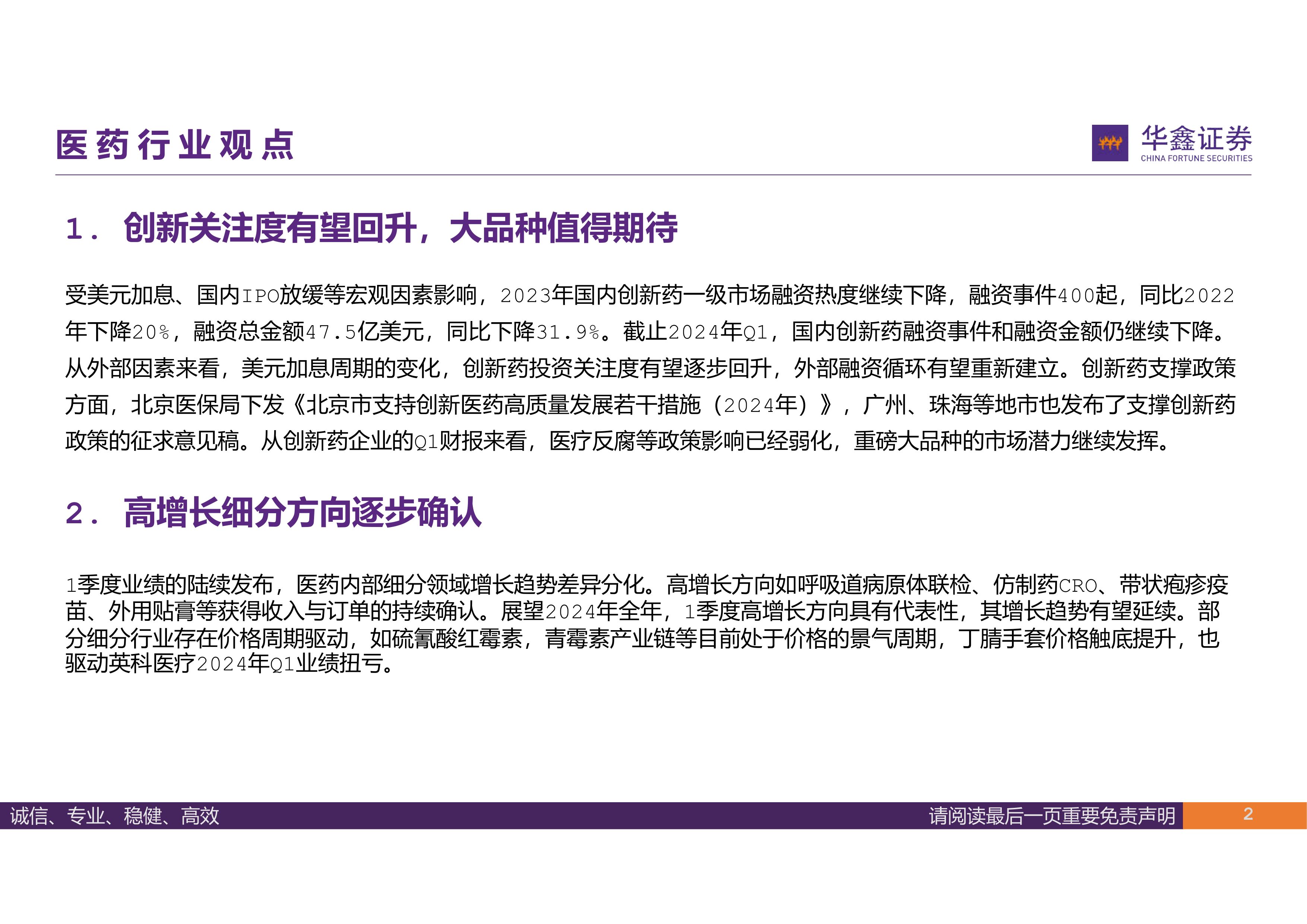 受美元加息、国内IPO放缓等宏观因素影响,2023年国内创新药一级市场融资热度继续下降,融资事件400起,同比2022年下降20%,融资总金额47.5亿美元,同比下降31.9%。截止2024年Q1,国内创新药融资事件和融资金额仍继续下降。从外部因素来看,美元加息周期的变化,创新药投资关注度有望逐步回升,外部融资循环有望重新建立。创新药支撑政策方面,北京医保局下发《北京市支持创新医药高质量发展若干措施(2024年)》,广州、珠海等地市也发布了支撑创新药政策的征求意见稿。从创新药企业的Q1财报来看,医疗反腐等政策影响已经弱化,重磅大品种的市场潜力继续发挥。