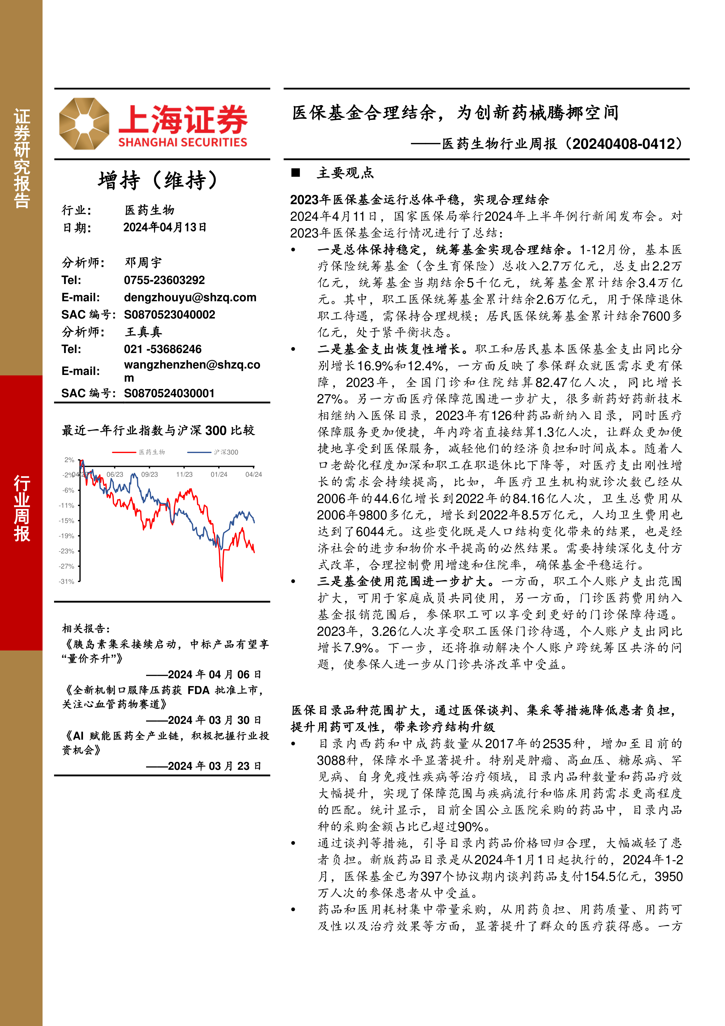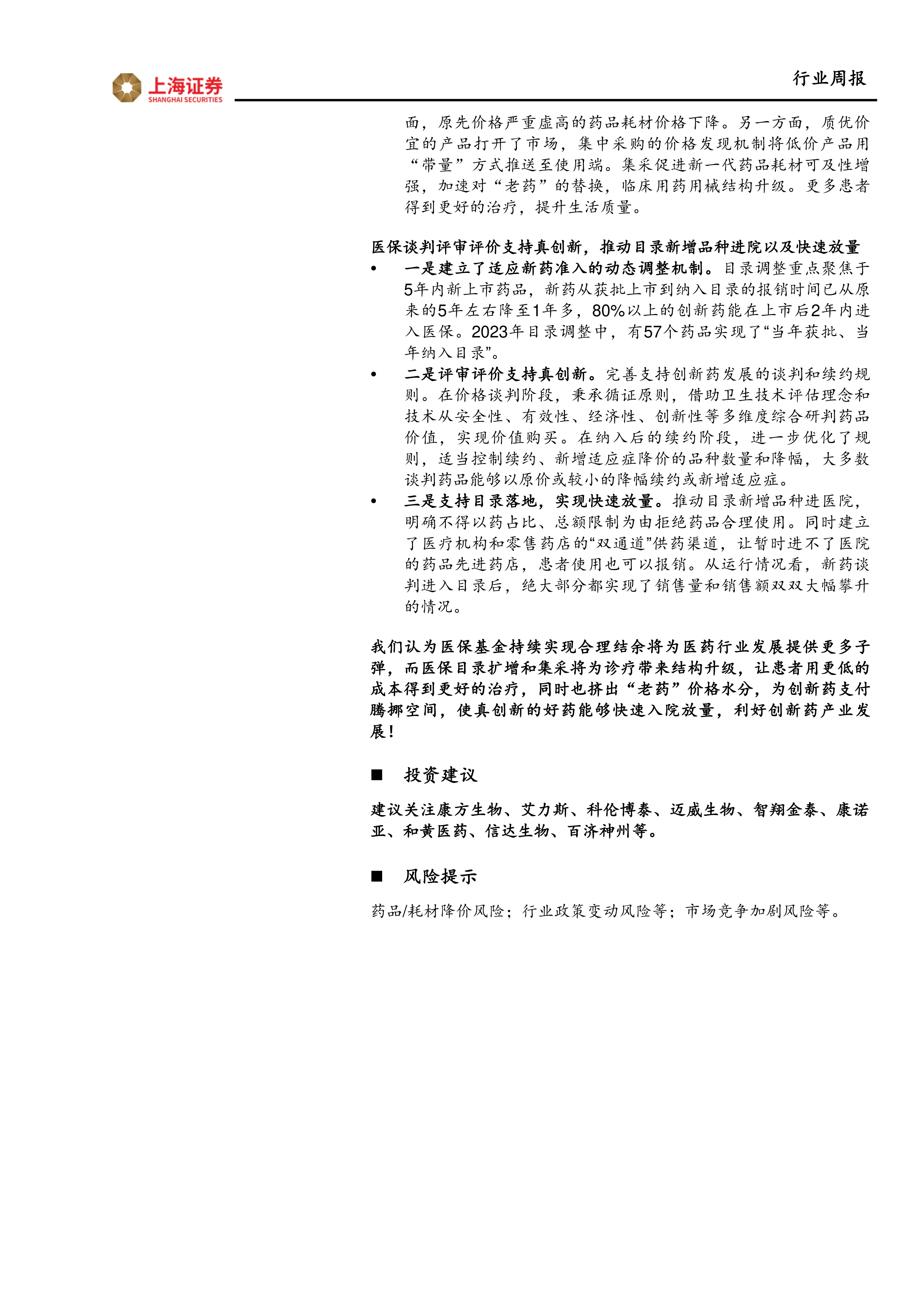 本报告的核心观点是:2023年中国医保基金运行平稳,实现合理结余,这为创新药械发展提供了有利条件。医保目录的扩增和集采政策的实施,一方面降低了患者负担,提升了医疗可及性,另一方面也促进了诊疗结构升级,为创新药的市场准入和快速放量创造了空间。