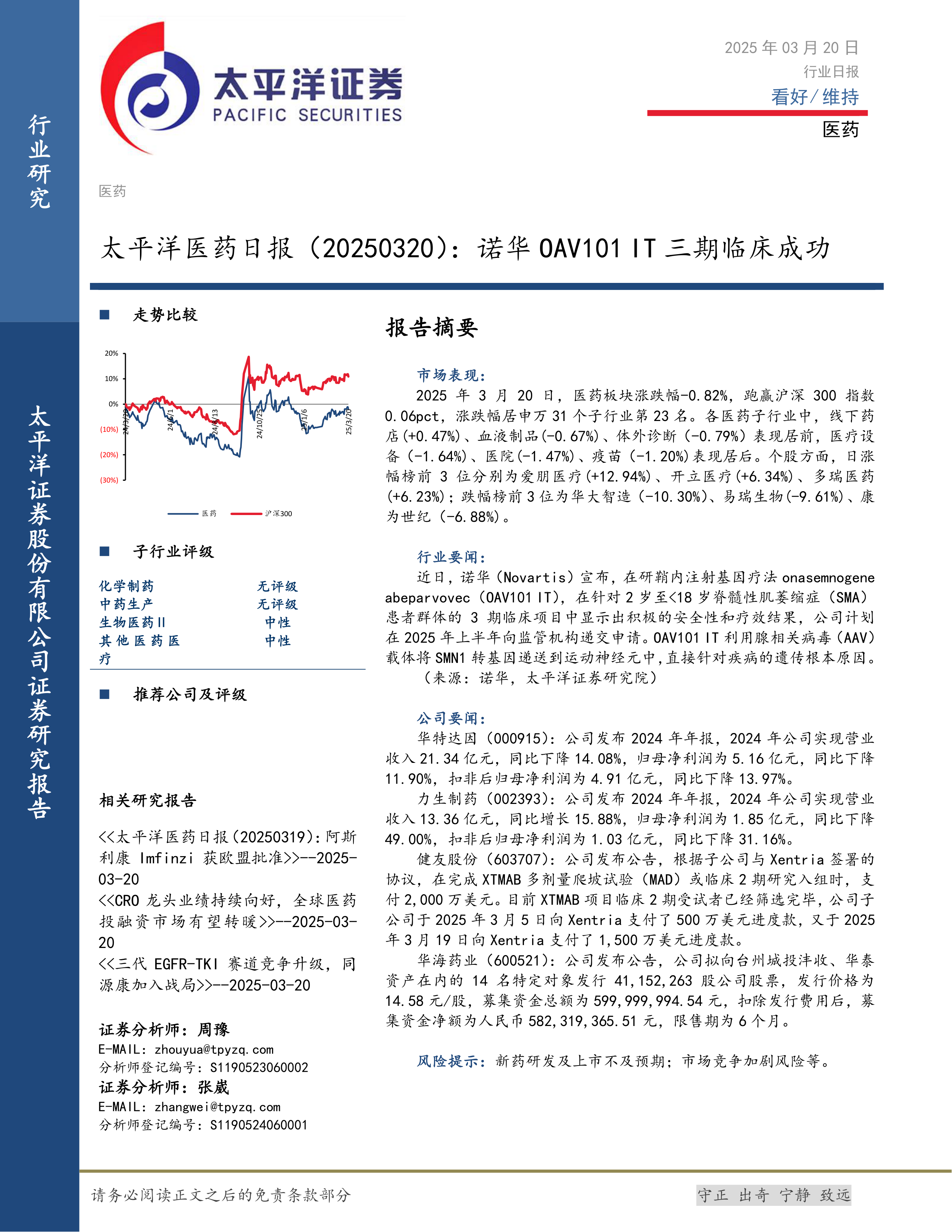 本报告对2025年3月20日医药行业市场表现进行了分析,指出医药板块整体表现略逊于沪深300指数,但个股表现分化明显。诺华OAV101 IT三期临床成功的积极结果为SMA治疗带来了新的希望,值得持续关注。同时,部分公司年报显示业绩增速放缓甚至下滑,反映出行业面临的挑战。 投资者需密切关注行业动态及公司业绩,谨慎投资。 报告中提供的公司财务数据和市场表现数据,为投资者提供了重要的参考信息,但需结合自身风险承受能力和投资策略进行综合判断。
