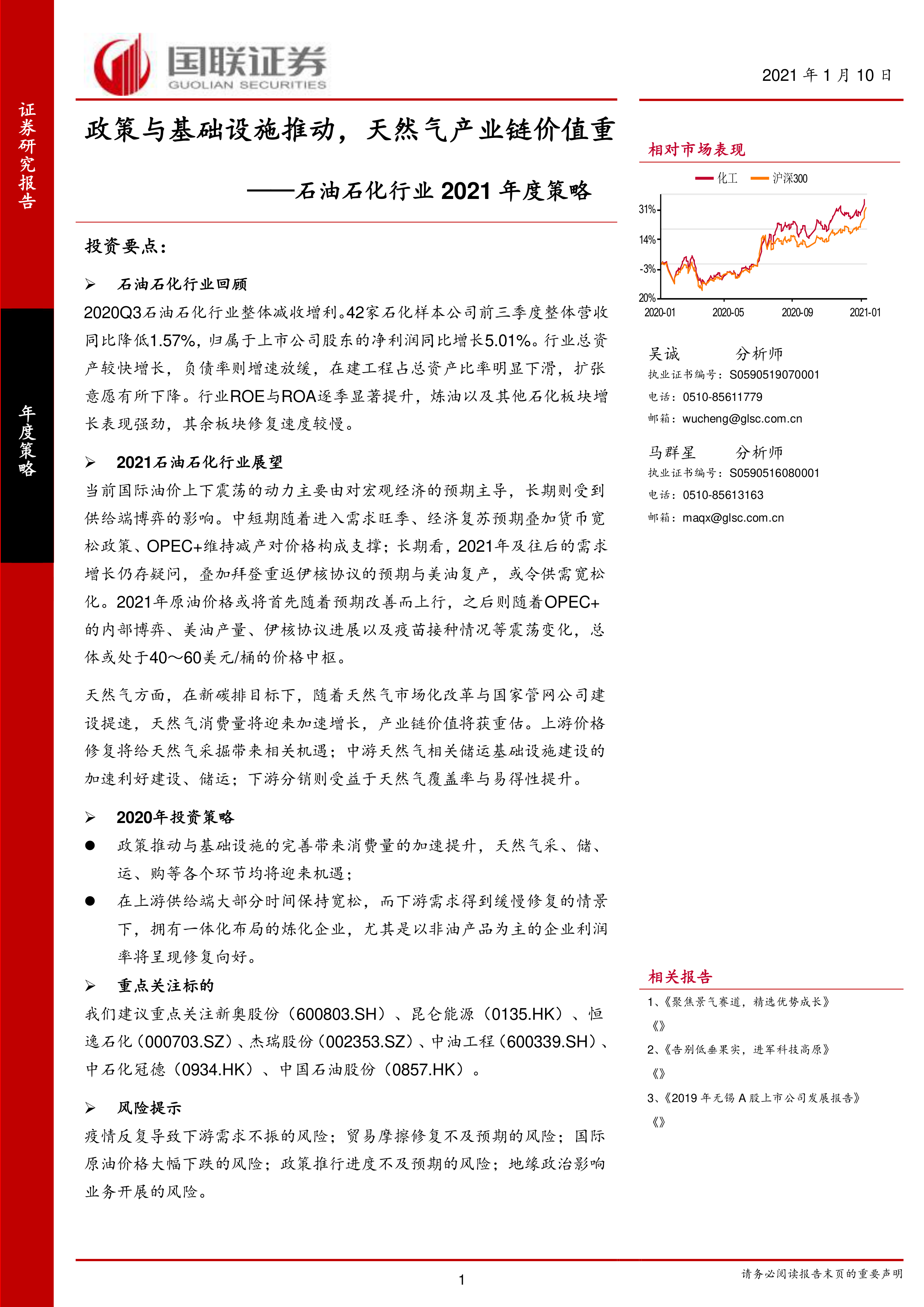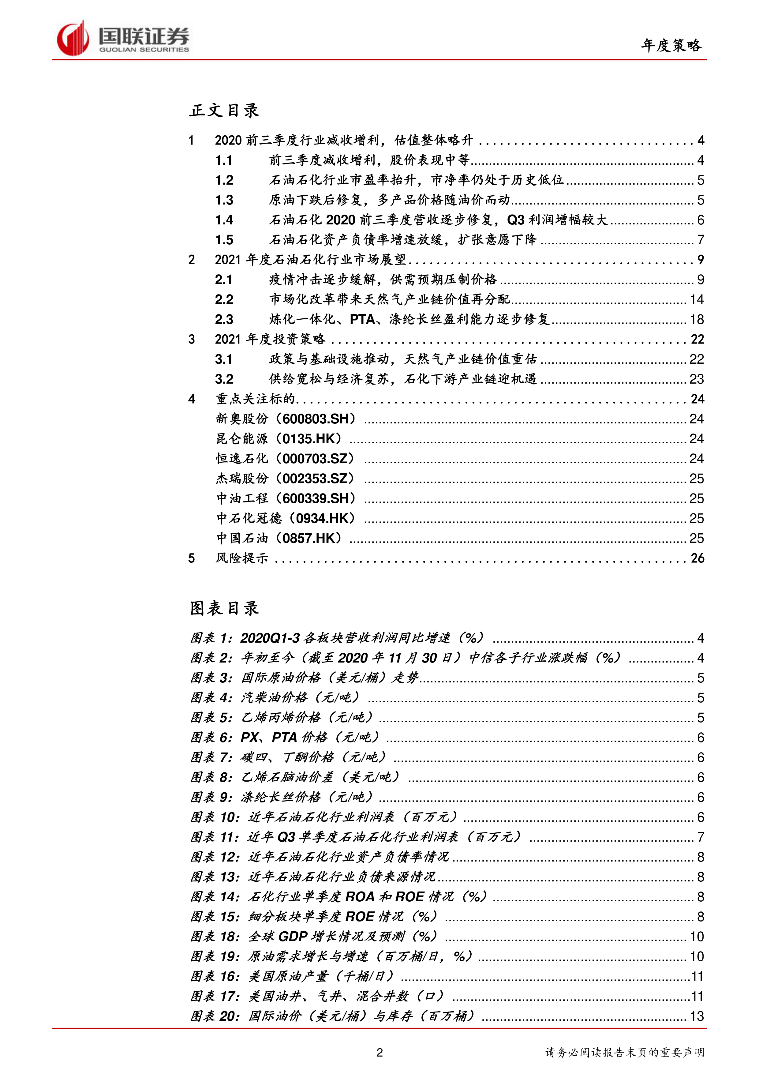 本报告的核心观点是:2020年前三季度,尽管石油石化行业整体营收同比下降,但净利润却实现了增长。2021年,受宏观经济预期、OPEC+减产策略以及地缘政治等因素影响,国际油价将震荡于40-60美元/桶区间。同时,国家政策与基础设施建设的推动将重估天然气产业链价值,为天然气采、储、运、销等环节带来机遇。下游石化产业链,特别是炼化一体化企业,将在供给宽松和经济复苏的背景下迎来发展机遇。