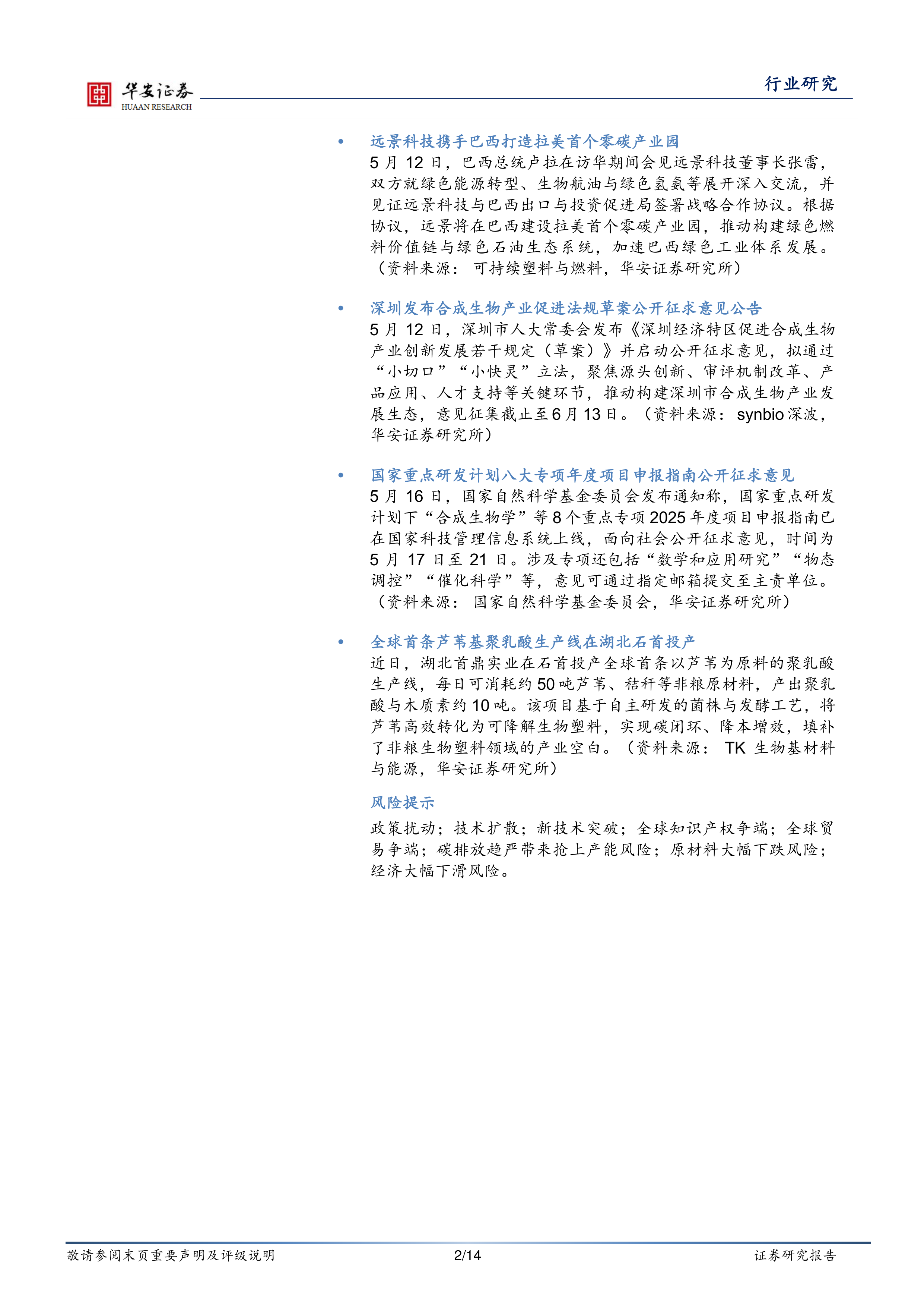5月12日,深圳市人大常委会发布《深圳经济特区促进合成生物产业创新发展若干规定(草案)》并启动公开征求意见,拟通过“小切口”“小快灵”立法,聚焦源头创新、审评机制改革、产品应用、人才支持等关键环节,推动构建深圳市合成生物产业发展生态,意见征集截止至6月13日。(资料来源:synbio深波,华安证券研究所)