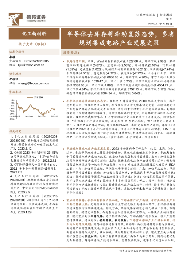 本报告的核心观点是:半导体去库存进程将显著影响化工新材料行业的复苏态势,而多省市积极规划集成电路产业发展,则为行业长期发展提供了利好。报告同时对本周化工新材料市场行情进行了回顾,并对部分重点公司进行了分析,并提出了相应的投资建议。