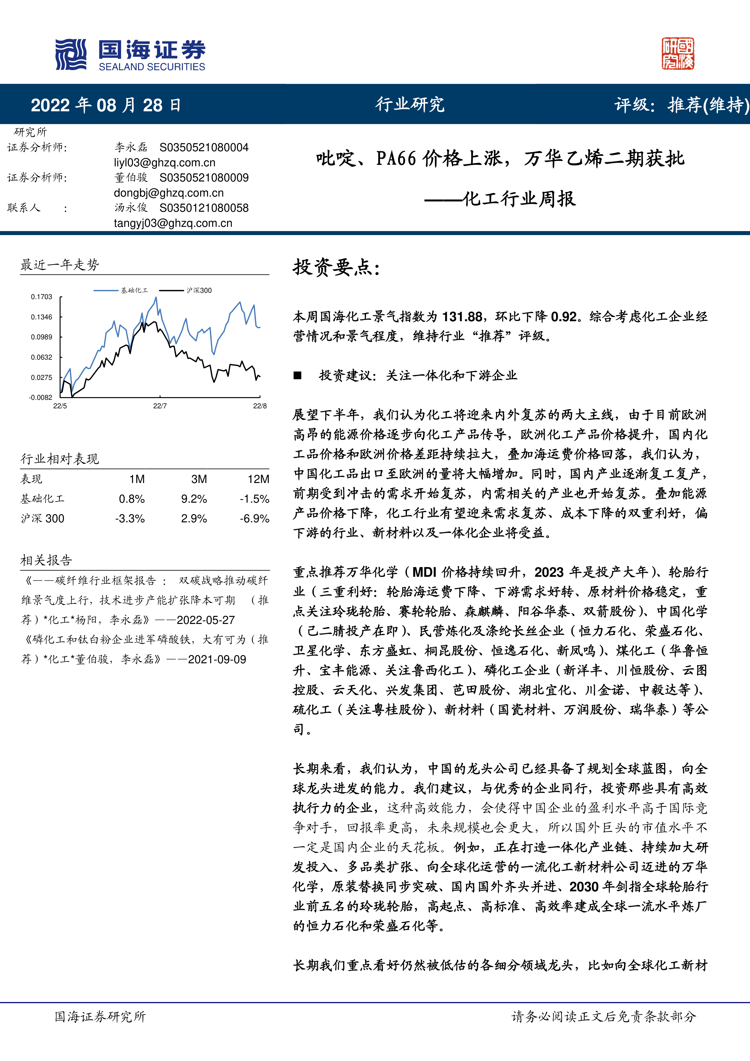 本报告基于对2022年8月化工行业市场数据和公司信息的全面分析,维持了对化工行业的“推荐”评级。报告认为,下半年化工行业将受益于国内外市场的复苏,一体化企业和下游企业将获得更大的发展机遇。报告重点推荐了一批具有竞争优势的化工企业,并对这些企业的未来发展趋势进行了预测,同时提醒投资者关注投资风险。 报告中提供的图表数据和公司信息,为投资者提供了较为全面的行业分析和投资参考。