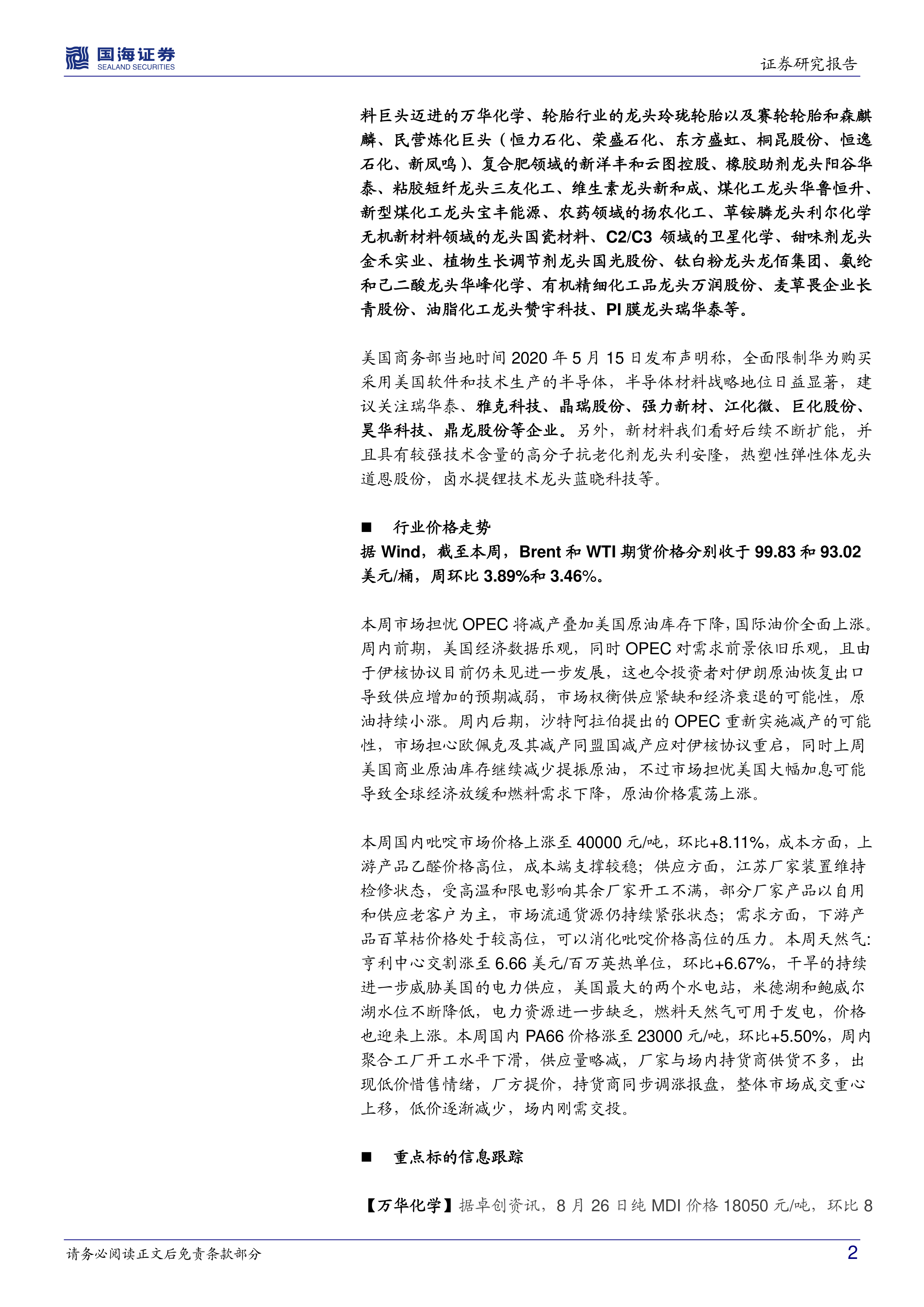 长期我们重点看好仍然被低估的各细分领域龙头,比如向全球化工新材料巨头迈进的万华化学、轮胎行业的龙头玲珑轮胎以及赛轮轮胎和森麒麟、民营炼化巨头(恒力石化、荣盛石化、东方盛虹、桐昆股份、恒逸石化、新凤鸣)、复合肥领域的新洋丰和云图控股、橡胶助剂龙头阳谷华泰、粘胶短纤龙头三友化工、维生素龙头新和成、煤化工龙头华鲁恒升、新型煤化工龙头宝丰能源、农药领域的扬农化工、草铵膦龙头利尔化学无机新材料领域的龙头国瓷材料、C2/C3领域的卫星化学、甜味剂龙头金禾实业、植物生长调节剂龙头国光股份、钛白粉龙头龙佰集团、氨纶和己二酸龙头华峰化学、有机精细化工品龙头万润股份、麦草畏企业长青股份、油脂化工龙头赞宇科技、PI膜龙头瑞华泰等。