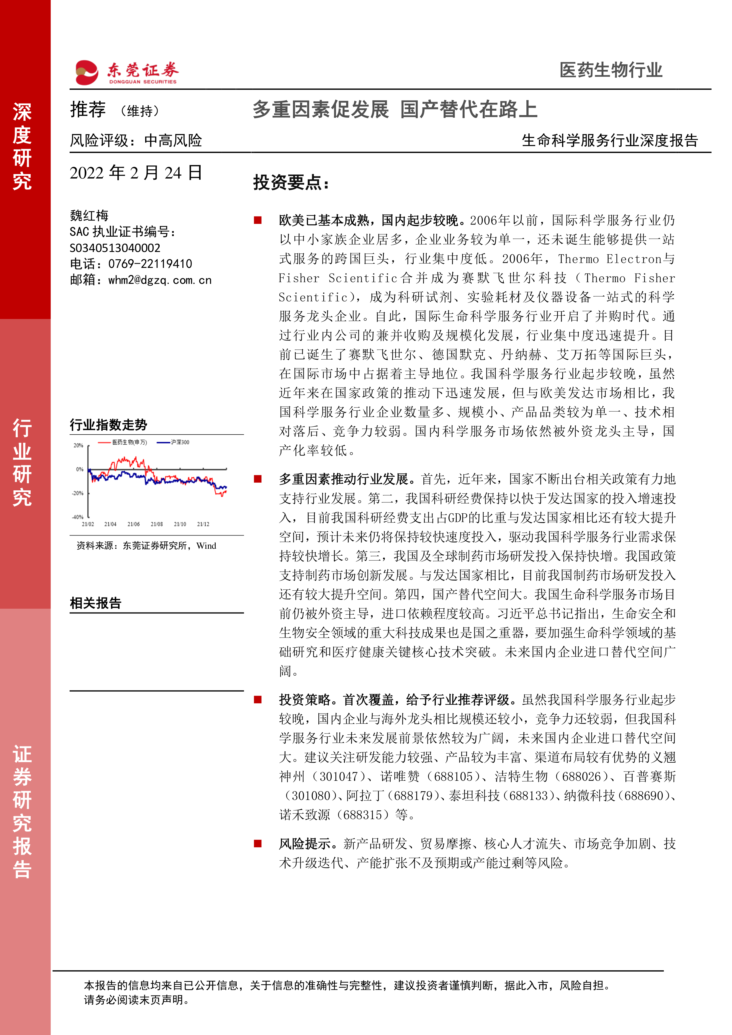 报告建议关注研发能力强、产品丰富、渠道布局有优势的国内生命科学服务企业,并给予行业“推荐”评级。