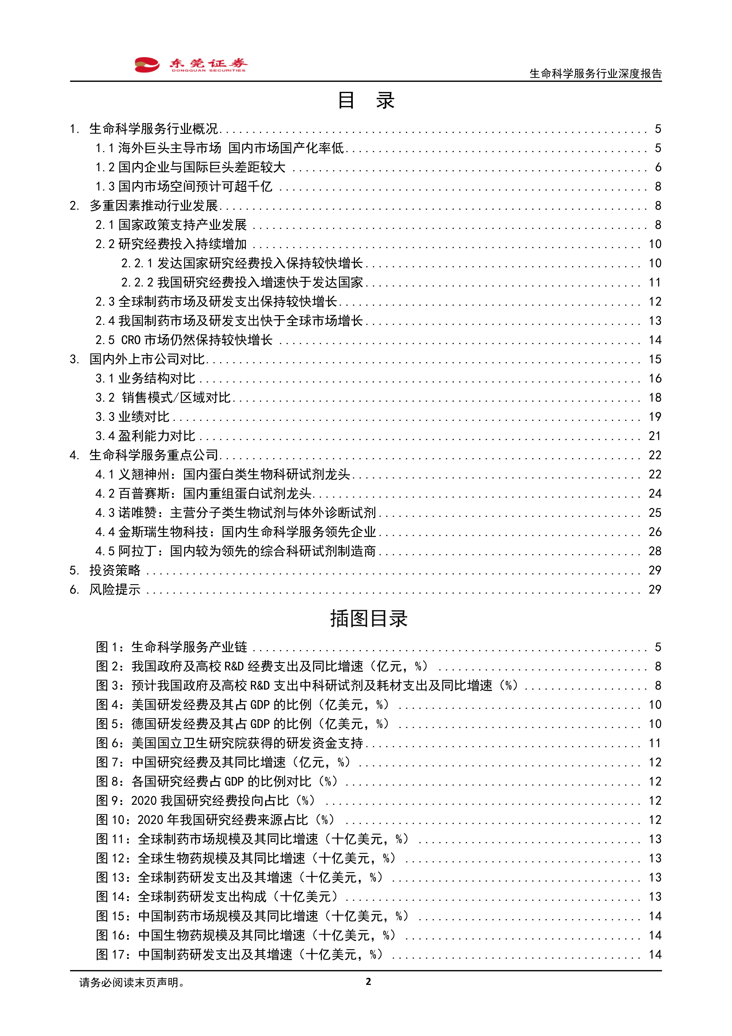 本报告的核心观点是:中国生命科学服务行业虽然起步较晚,与欧美发达国家相比,企业规模较小,竞争力较弱,国产化率低,但其发展前景广阔,具备巨大的进口替代空间。多重因素推动行业发展,包括国家政策支持、科研经费持续增加、制药市场研发投入快速增长以及国产替代需求旺盛等。报告建议关注研发能力强、产品丰富、渠道布局有优势的国内企业。