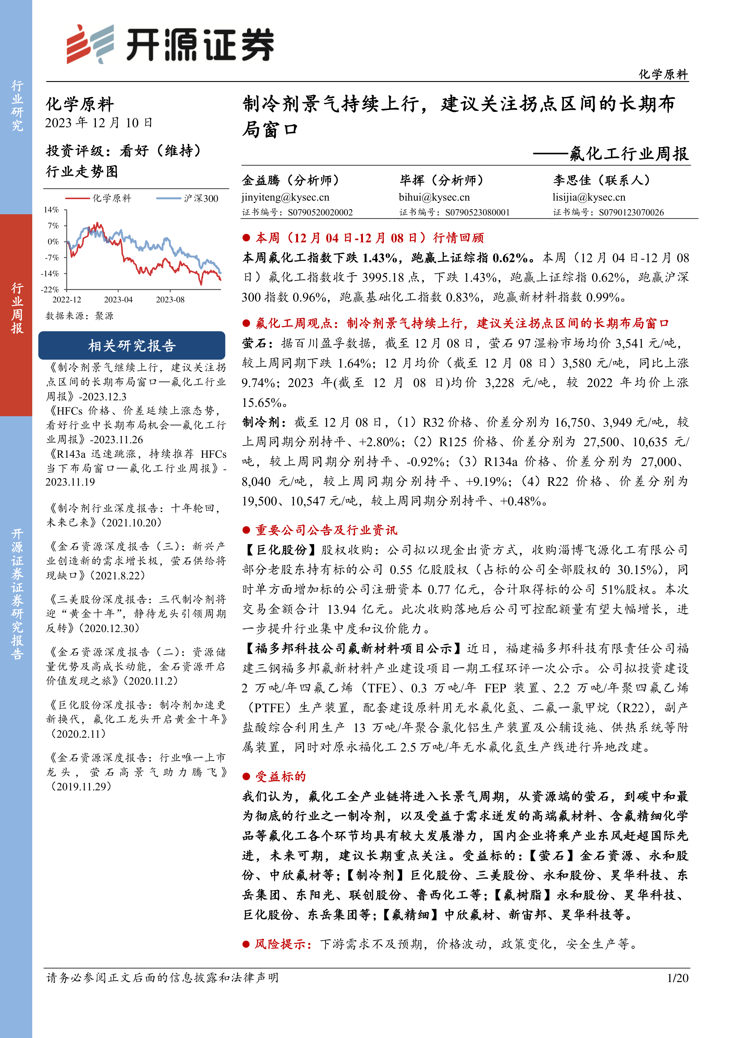氟化工行业周报:制冷剂景气持续上行,建议关注拐点区间的长期布局窗口