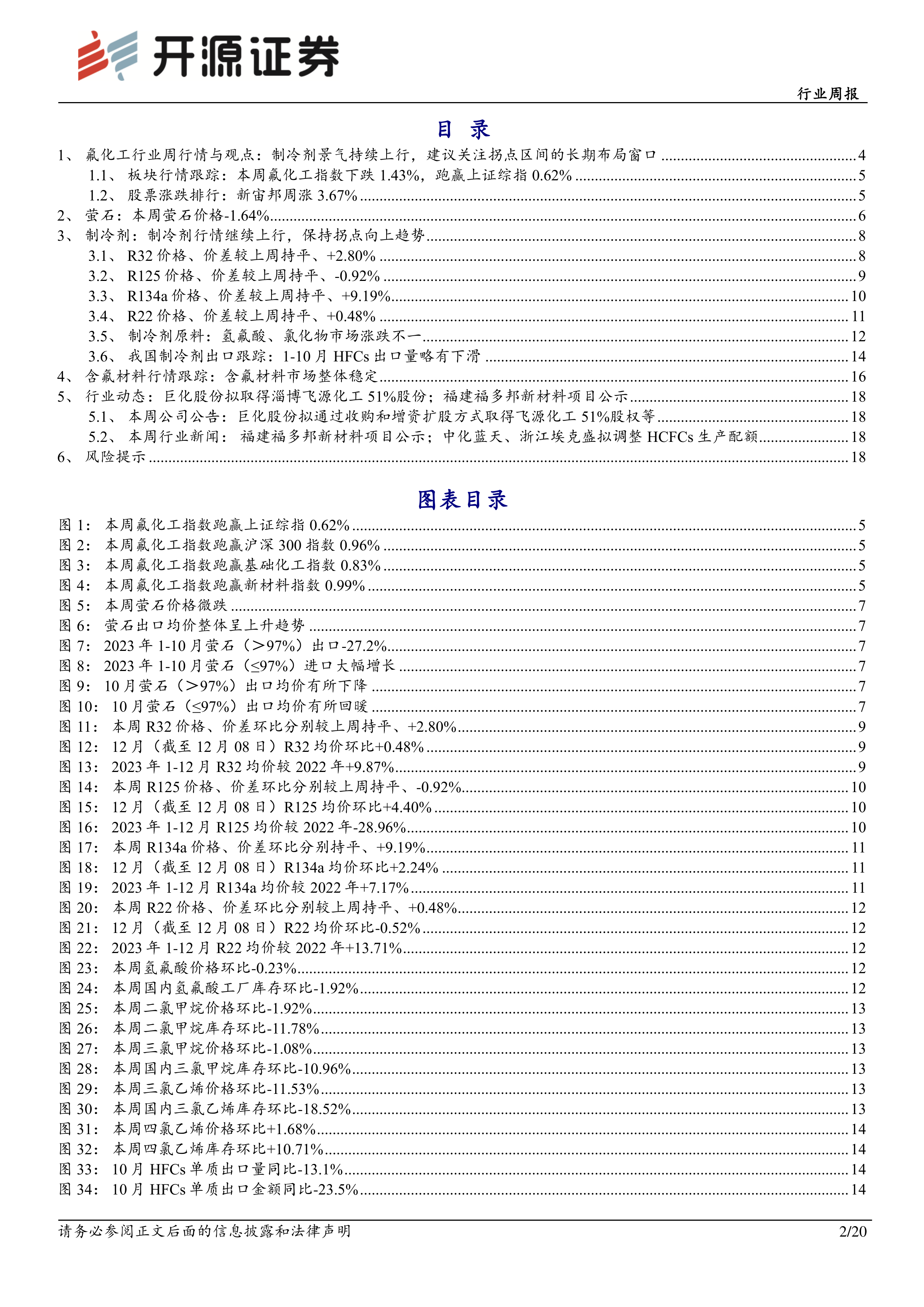 本报告通过对氟化工行业,特别是萤石和制冷剂市场的价格、产量、进出口数据以及行业动态的分析,得出结论:制冷剂市场景气持续上行,但需关注拐点区间;萤石市场价格波动,但长期投资价值凸显;含氟材料市场整体稳定。报告建议投资者关注氟化工行业长期布局机会,并提示了下游需求不及预期、价格波动、政策变化和安全生产等风险。 报告中大量图表数据支持了其分析结论,为投资者提供了较为全面的市场信息和投资建议。 需要注意的是,报告中提到的投资建议仅供参考,投资者应根据自身情况进行独立判断。