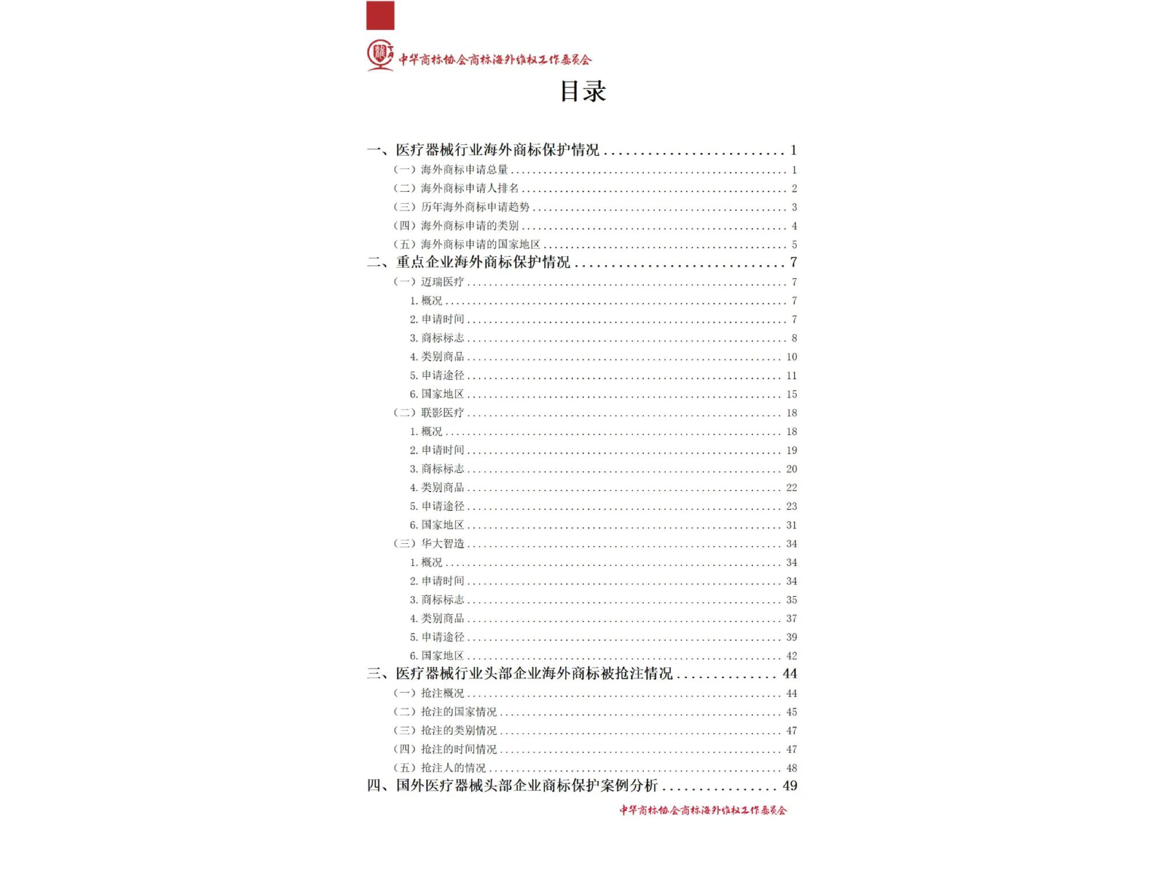 本报告基于中华商标协会商标海外维权工作委员会提供的医疗器械行业海外商标保护白皮书数据,对我国医疗器械企业海外商标保护现状进行统计分析,并结合重点企业案例(迈瑞医疗、联影医疗、华大智造)和国外企业案例(美敦力)进行深入探讨,最终提出相应的建议。核心观点如下: