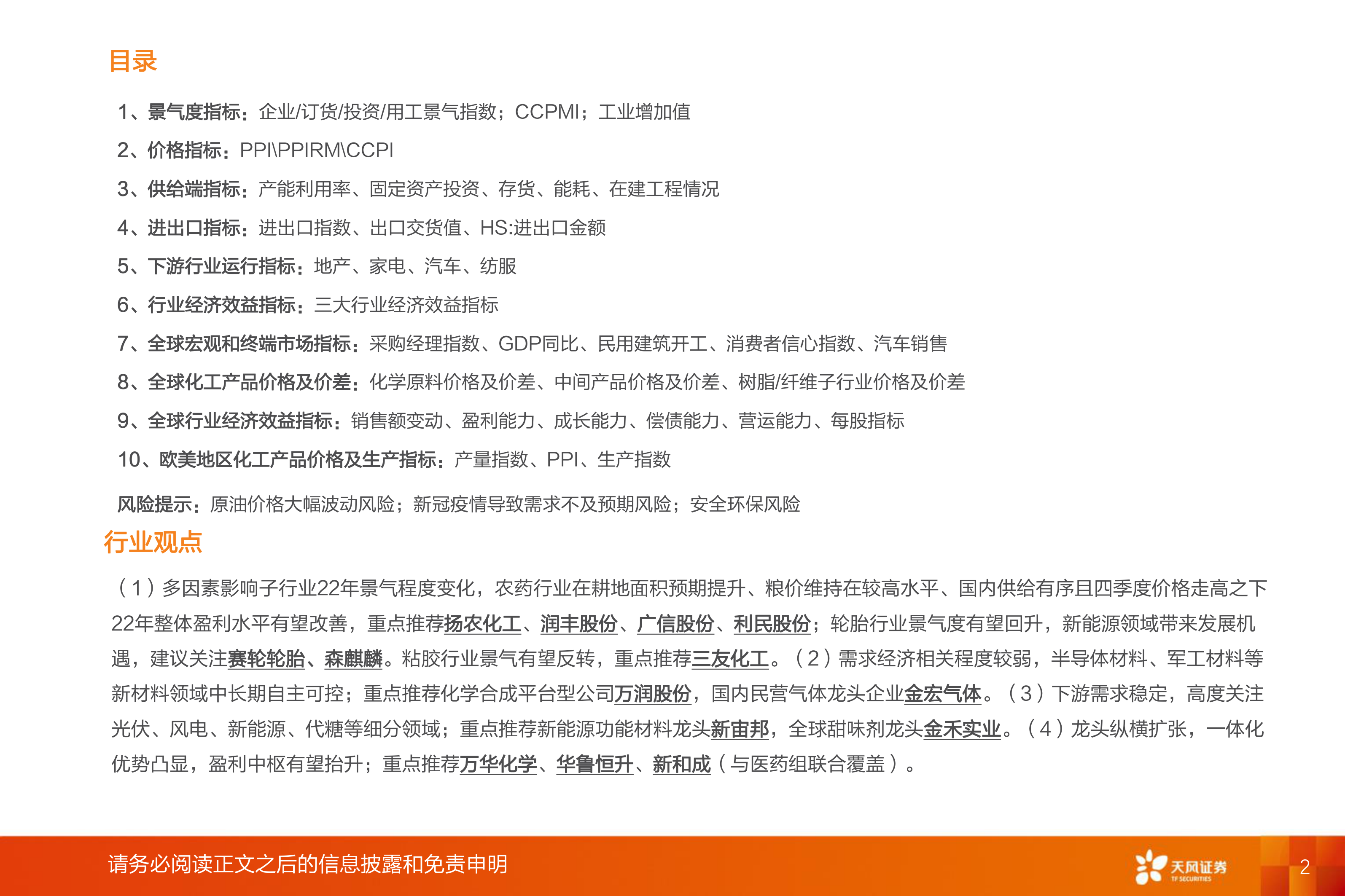 (1)多因素影响子行业22年景气程度变化,农药行业在耕地面积预期提升、粮价维持在较高水平、国内供给有序且四季度价格走高之下22年整体盈利水平有望改善,重点推荐扬农化工、润丰股份、广信股份、利民股份;轮胎行业景气度有望回升,新能源领域带来发展机遇,建议关注赛轮轮胎、森麒麟。粘胶行业景气有望反转,重点推荐三友化工。(2)需求经济相关程度较弱,半导体材料、军工材料等新材料领域中长期自主可控;重点推荐化学合成平台型公司万润股份,国内民营气体龙头企业金宏气体。(3)下游需求稳定,高度关注光伏、风电、新能源、代糖等细分领域;重点推荐新能源功能材料龙头新宙邦,全球甜味剂龙头金禾实业。(4)龙头纵横扩张,一体化优势凸显,盈利中枢有望抬升;重点推荐万华化学、华鲁恒升、新和成(与医药组联合覆盖)。