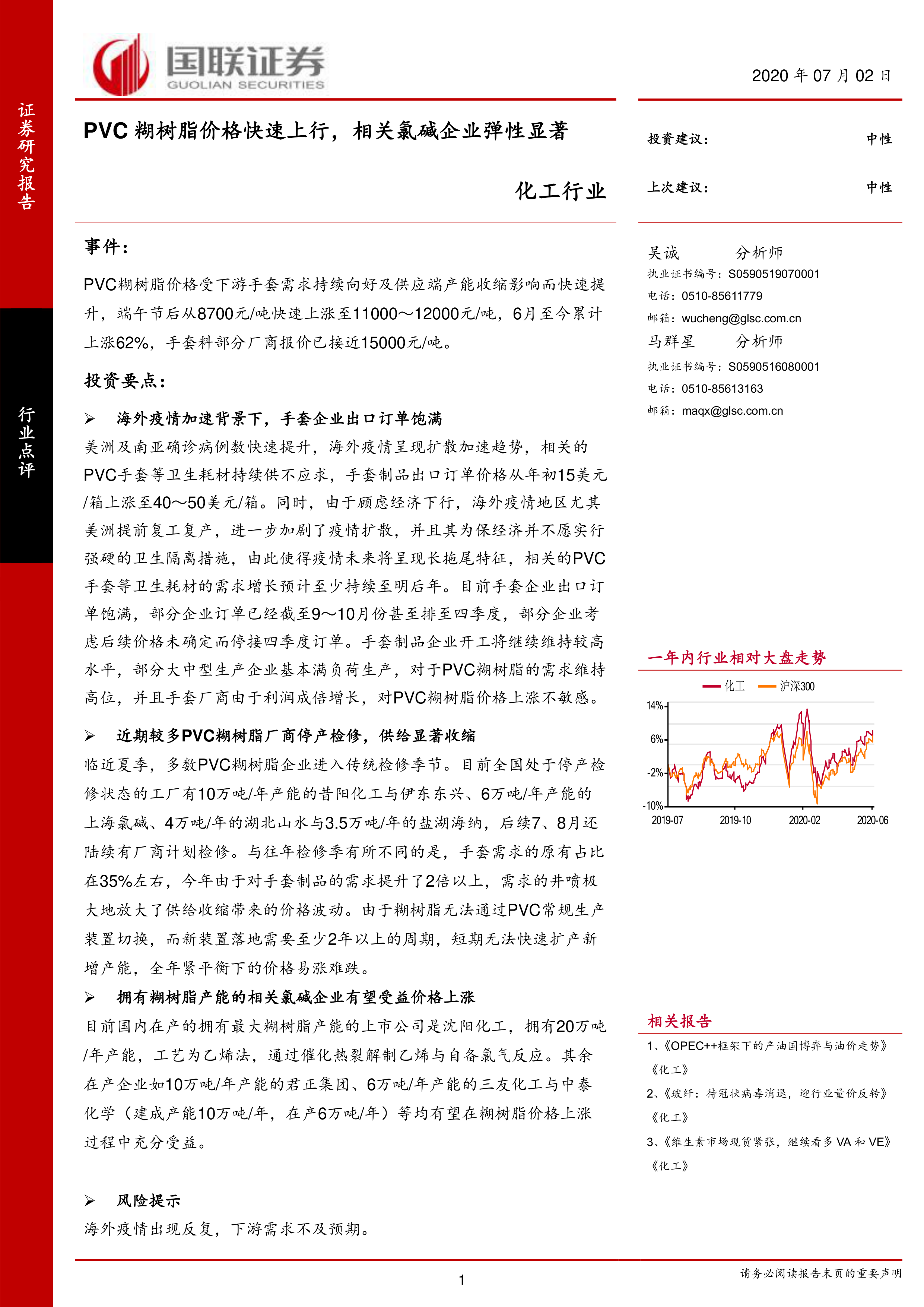 本报告分析了PVC糊树脂价格快速上涨的原因,主要归因于海外疫情持续导致的手套等卫生耗材需求激增以及国内供应端产能收缩。 报告指出,拥有糊树脂产能的相关氯碱企业将受益于价格上涨,但同时也存在海外疫情反复和下游需求不及预期的风险。 报告建议对相关企业保持中性态度,并提醒投资者关注市场风险。 报告数据显示,化工行业在一年内跑赢沪深300指数,但未来走势仍需密切关注疫情发展和市场供需变化。