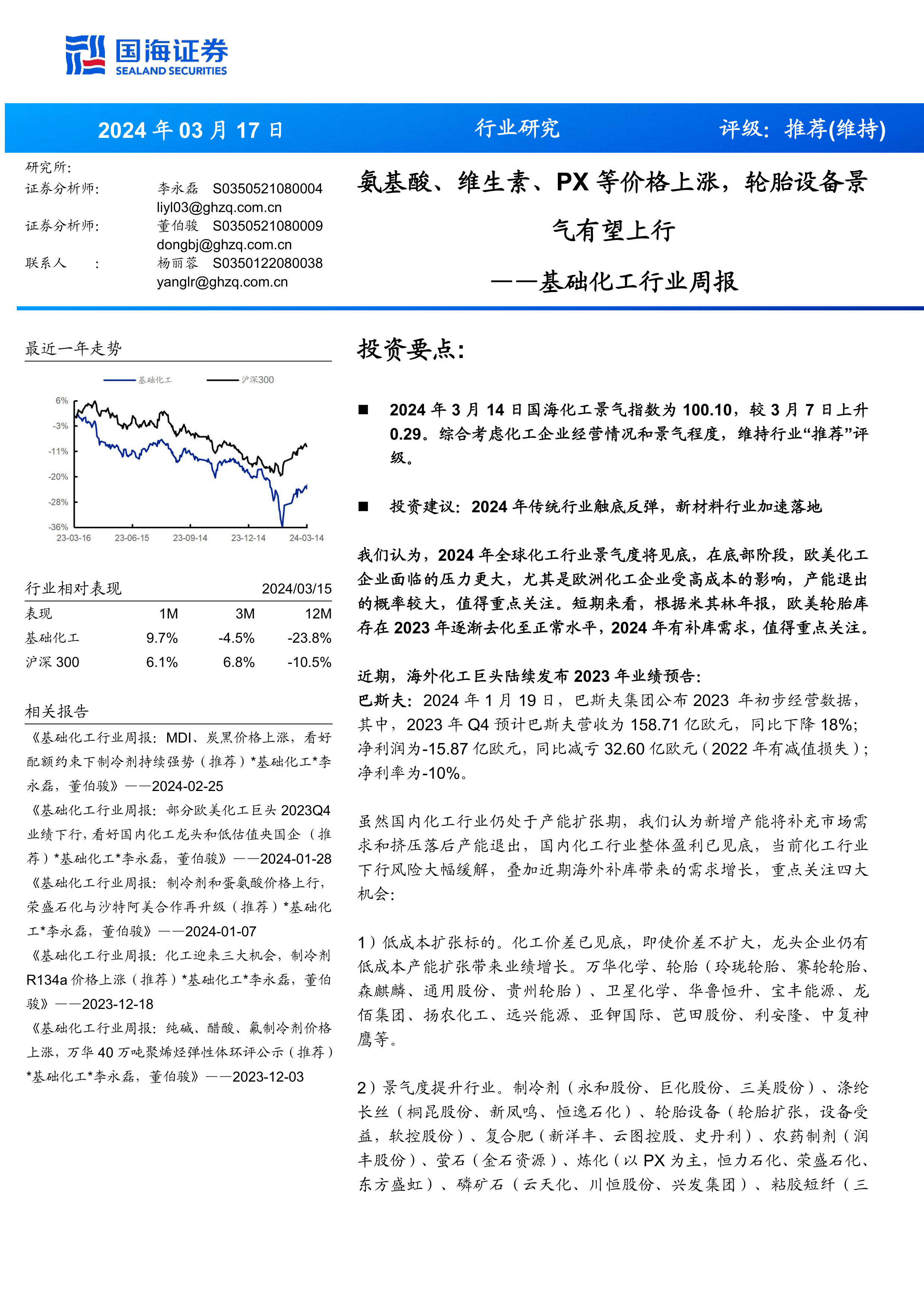 报告指出2024年3月14日国海化工景气指数为100.10,较3月7日上升0.29,维持行业“推荐”评级。 报告认为2024年全球化工行业景气度将见底,欧美企业面临更大压力,而国内化工行业盈利已见底,下行风险缓解,并受益于海外补库带来的需求增长。 报告还分析了近期海外化工巨头(巴斯夫、亨斯迈、杜邦、陶氏)的2023年业绩预告,显示其业绩普遍下行,进一步佐证了全球化工行业景气度低迷的现状,也凸显了国内化工龙头的相对优势。