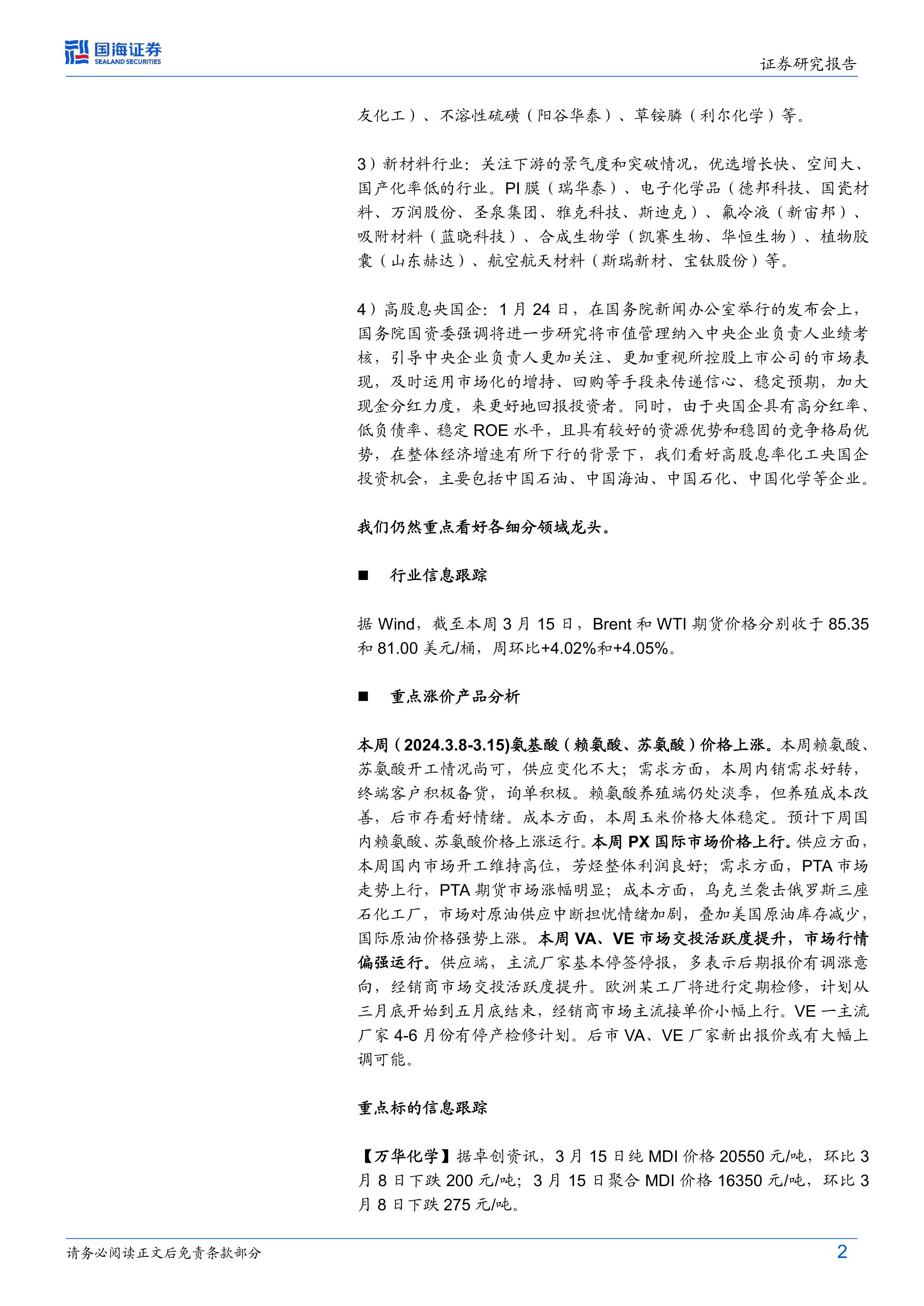 本报告对2024年3月15日一周的化工行业进行了全面分析,维持基础化工行业“推荐”评级,并重点推荐了低成本扩张标的、景气度提升行业、新材料行业以及高股息央国企四大投资机会。报告提供了大量的数据和图表,对重点产品的价格波动以及重点公司的经营情况进行了详细解读,为投资者提供了有价值的参考信息。 然而,报告也提示了宏观经济变化、油价震荡、环保趋严以及产品价格大幅波动等风险因素。 投资者应谨慎参考报告内容,并结合自身情况进行投资决策。