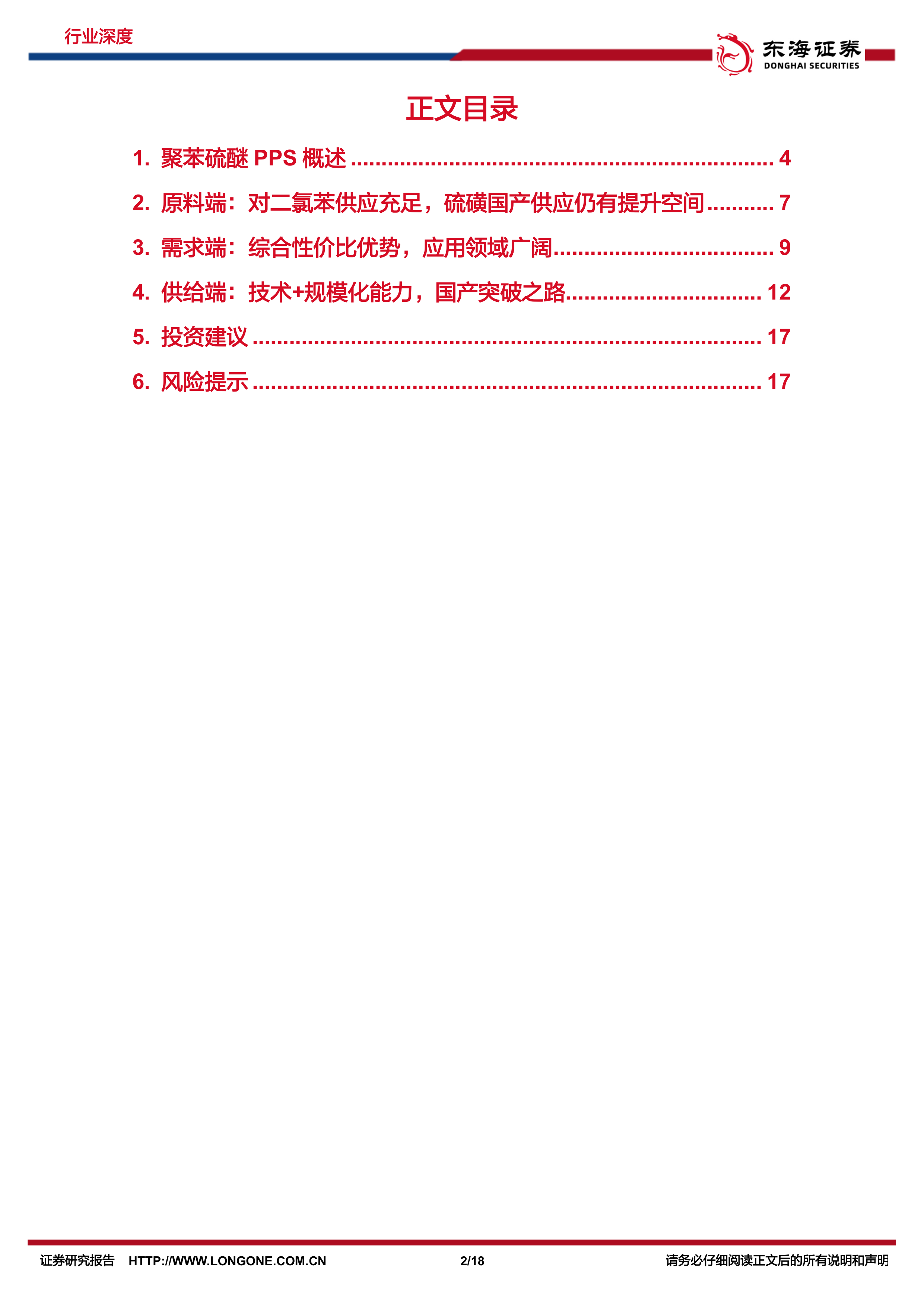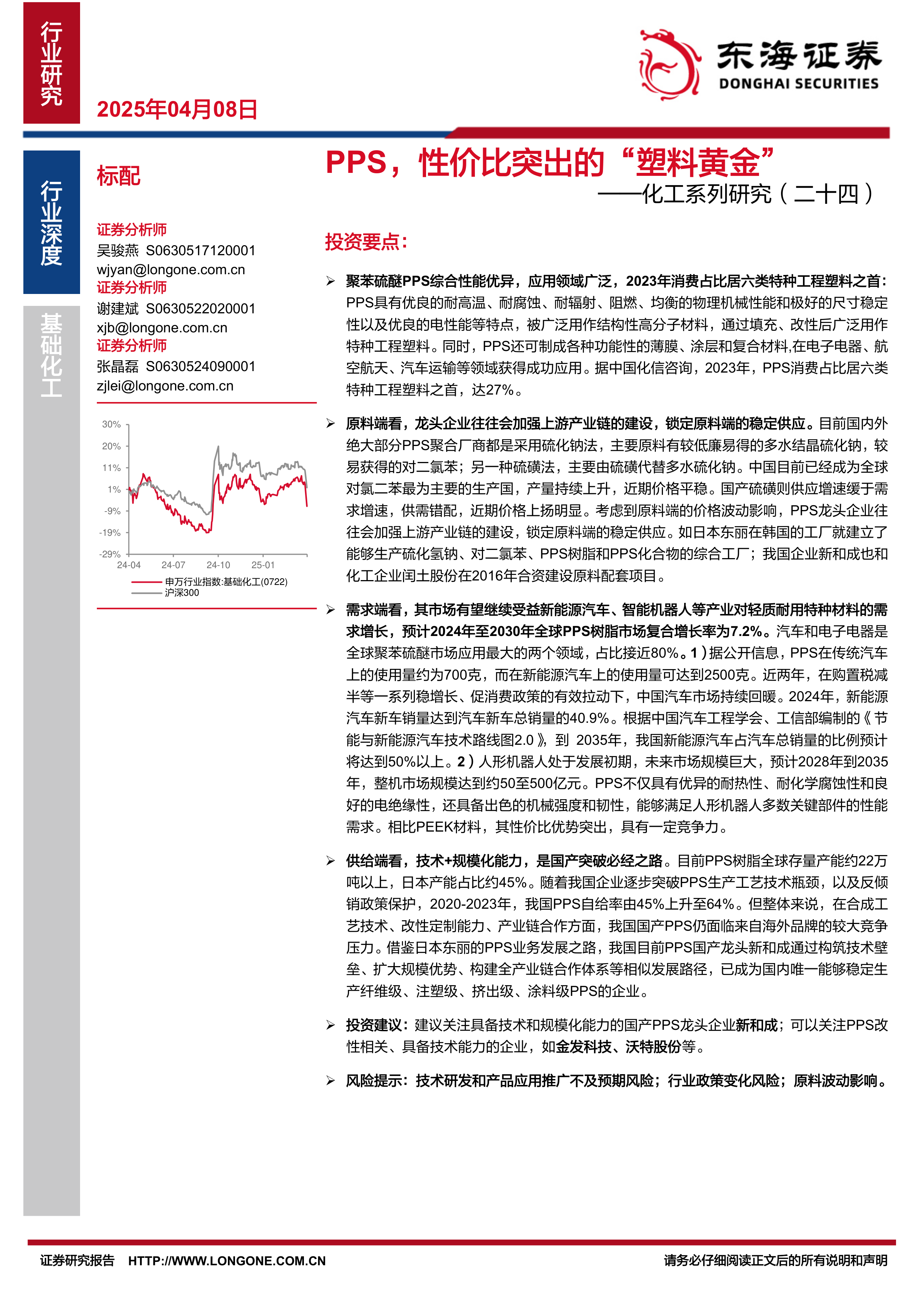 报告最后给出了投资建议,建议关注具备技术和规模化能力的国产PPS龙头企业新和成,以及PPS改性相关企业,如金发科技、沃特股份等。同时,报告也指出了技术研发风险、行业政策变化风险和原料波动风险等潜在风险。